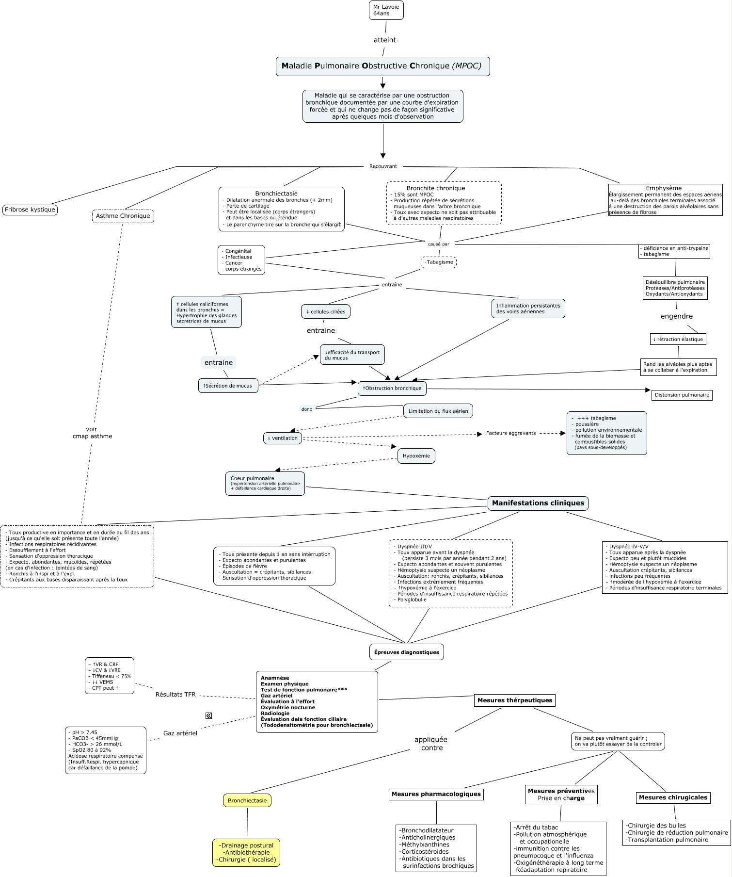 Cette carte de concepts créée avec IHMC CmapTools traite de: MPOC.finale, Recouvrant Asthme Chronique, Bronchiectasie - Dilatation anormale des bronches (+ 2mm) - Perte de cartilage - Peut être localisée (corps étrangers) et dans les bases ou étendue - Le parenchyme tire sur la bronche qui s'élargit causé par - déficience en anti-trypsine - tabagisme, Ne peut pas vraiment guérir ; on va plutôt essayer de la controler Mesures préventives Prise en charge, Maladie Pulmonaire Obstructive Chronique (MPOC) Maladie qui se caractérise par une obstruction bronchique documentée par une courbe d'expiration forcée et qui ne change pas de façon significative après quelques mois d'observation, Déséquilibre pulmonaire Protéases/Antiprotéases Oxydants/Antioxydants engendre ↓ rétraction élastique, - Congénital - Infectieuse - Cancer - corps étrangés causé par -Tabagisme, Coeur pulmonaire (hypertension artérielle pulmonaire + défaillance cardiaque droite) Manifestations cliniques - Dyspnée IV-V/V - Toux apparue après la dyspnée - Expecto peu et plutôt mucoïdes - Hémoptysie suspecte un néoplasme - Auscultation crépitants, sibilances - infections peu fréquentes - ↑modérée de l'hypoxémie à l'exercice - Périodes d'insuffisance respiratoire terminales, Bronchiectasie -Drainage postural -Antibiothérapie -Chirurgie ( localisé), Anamnèse Examen physique Test de fonction pulmonaire*** Gaz artériel Évaluation à l'effort Oxymétrie nocturne Radiologie Évaluation dela fonction ciliaire (Tododensitométrie pour bronchiectasie) Résultats TFR - ↑VR & CRF - ↓CV & ↓VRE - Tiffeneau < 75% - ↓↓ VEMS - CPT peut ↑, -Tabagisme entraîne, ↑ cellules caliciformes dans les bronches = Hypertrophie des glandes sécrétrices de mucus entraine ↑Sécrétion de mucus, Bronchiectasie - Dilatation anormale des bronches (+ 2mm) - Perte de cartilage - Peut être localisée (corps étrangers) et dans les bases ou étendue - Le parenchyme tire sur la bronche qui s'élargit causé par -Tabagisme, Coeur pulmonaire (hypertension artérielle pulmonaire + défaillance cardiaque droite) Manifestations cliniques - Dyspnée III/V - Toux apparue avant la dyspnée (persiste 3 mois par année pendant 2 ans) - Expecto abondantes et souvent purulentes - Hémoptysie suspecte un néoplasme - Auscultation: ronchis, crépitants, sibilances - Infections extrêmement fréquentes - ↑hypoxémie à l'exercice - Périodes d'insuffissance respiratoire répétées - Polyglobulie, Anamnèse Examen physique Test de fonction pulmonaire*** Gaz artériel Évaluation à l'effort Oxymétrie nocturne Radiologie Évaluation dela fonction ciliaire (Tododensitométrie pour bronchiectasie) Gaz artériel - pH > 7.45 - PaCO2 < 45mmHg - HCO3- > 26 mmol/L - SpO2 80 à 92% Acidose respiratoire compensé (Insuff.Respi. hypercapnique car défaillance de la pompe), Recouvrant Bronchite chronique - 15% sont MPOC - Production répétée de sécrétions muqueuses dans l'arbre bronchique - Toux avec expecto ne soit pas attribuable à d'autres maladies respiratoires, Emphysème Élargissement permanent des espaces aériens au-delà des bronchioles terminales associé à une destruction des parois alvéolaires sans présence de fibrose causé par -Tabagisme, - déficience en anti-trypsine - tabagisme Déséquilibre pulmonaire Protéases/Antiprotéases Oxydants/Antioxydants, Ne peut pas vraiment guérir ; on va plutôt essayer de la controler Mesures chirugicales, - Dyspnée III/V - Toux apparue avant la dyspnée (persiste 3 mois par année pendant 2 ans) - Expecto abondantes et souvent purulentes - Hémoptysie suspecte un néoplasme - Auscultation: ronchis, crépitants, sibilances - Infections extrêmement fréquentes - ↑hypoxémie à l'exercice - Périodes d'insuffissance respiratoire répétées - Polyglobulie Épreuves diagnostiques, Coeur pulmonaire (hypertension artérielle pulmonaire + défaillance cardiaque droite) Manifestations cliniques - Toux présente depuis 1 an sans intérruption - Expecto abondantes et purulentes - Épisodes de fièvre - Auscultation = crépitants, sibilances - Sensation d'oppression thoracique
