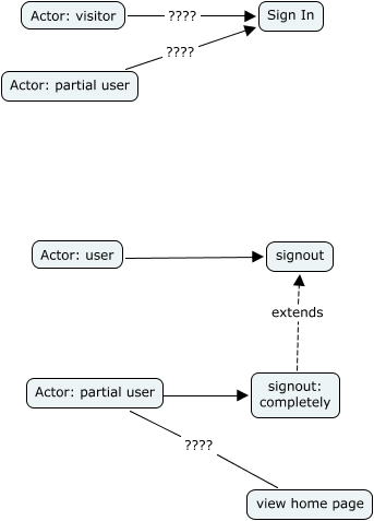 Deze Concept Map heeft informatie gerelateerd aan: LinkedIn-SignInSignout, Actor: partial user ???? view home page, Actor: partial user ???? Sign In, signout: completely extends signout, Actor: partial user ???? signout: completely, Actor: visitor ???? Sign In, Actor: user signout