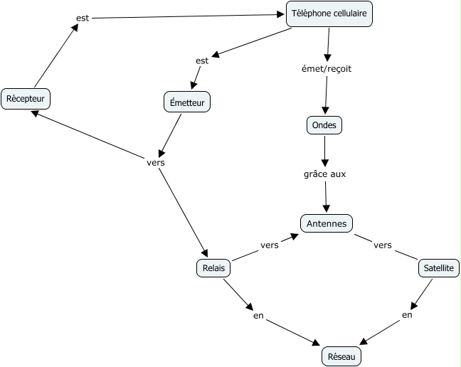This Concept Map, created with IHMC CmapTools, has information related to: ab_C-3 Téléphonie cellulaire2, Téléphone cellulaire est Émetteur, Ondes grâce aux Antennes, Satellite en Réseau, Relais en Réseau, Antennes vers Satellite, Récepteur est Téléphone cellulaire, Émetteur vers Récepteur, Émetteur vers Relais, Téléphone cellulaire émet/reçoit Ondes
