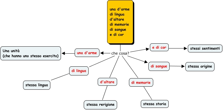 Questa Mappa Concettuale ha informazioni correlate a: definizione di patria (A.Manzoni), una d'arme di lingua d'altare di memorie di sangue e di cor che cosa? di memorie, di lingua ???? stessa lingua, una d'arme di lingua d'altare di memorie di sangue e di cor che cosa? di lingua, una d'arme di lingua d'altare di memorie di sangue e di cor che cosa? una d'arme, una d'arme di lingua d'altare di memorie di sangue e di cor che cosa? d'altare, una d'arme U Una unità (che hanno uno stesso esercito), d'altare ???? stessa rerigione, di memorie ???? stessa storia, di sangue ???? stessa origine, una d'arme di lingua d'altare di memorie di sangue e di cor che cosa? e di cor, e di cor ???? stessi sentimenti, una d'arme di lingua d'altare di memorie di sangue e di cor che cosa? di sangue