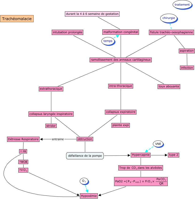 This Concept Map has information related to: trachéomalacie, aspiration infection, extrathoracique collapsus laryngée inspiratoire, intubation prolongée ramollissement des anneaux cartilagineux, fistule trachéo-oesophagienne aspiration, VNE Hypercapnie, ↑WOB <math xmlns="http://www.w3.org/1998/Math/MathML"> <mrow> <mtext> ↑V </mtext> <mmultiscripts> <mtext> O </mtext> <mtext> 2 </mtext> <none/> </mmultiscripts> </mrow> </math>, fistule trachéo-oesophagienne ramollissement des anneaux cartilagineux, chirurgie fistule trachéo-oesophagienne, Hypoxémie ↑ FR, collapsus expiratoire plainte expi
