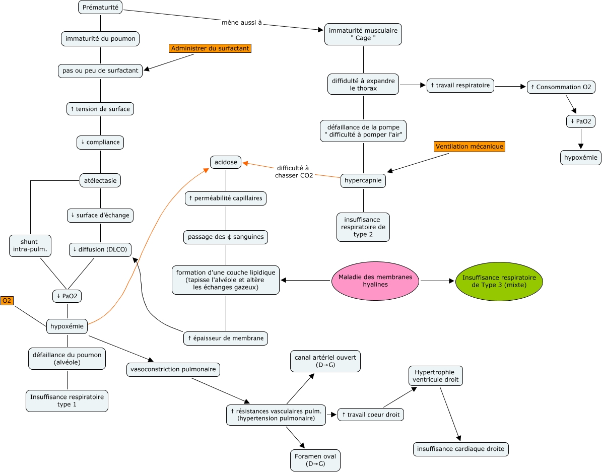 This Concept Map has information related to: maladie membrane hyaline, ↓ compliance atélectasie, ↑ perméabilité capillaires passage des ¢ sanguines, ↑ résistances vasculaires pulm. (hypertension pulmonaire) ↑ travail coeur droit, immaturité musculaire " Cage " diffidulté à expandre le thorax, hypoxémie vasoconstriction pulmonaire, Administrer du surfactant pas ou peu de surfactant, ↑ tension de surface ↓ compliance, pas ou peu de surfactant ↑ tension de surface, ↑ résistances vasculaires pulm. (hypertension pulmonaire) Foramen oval (D→G), hypoxémie défaillance du poumon (alvéole)