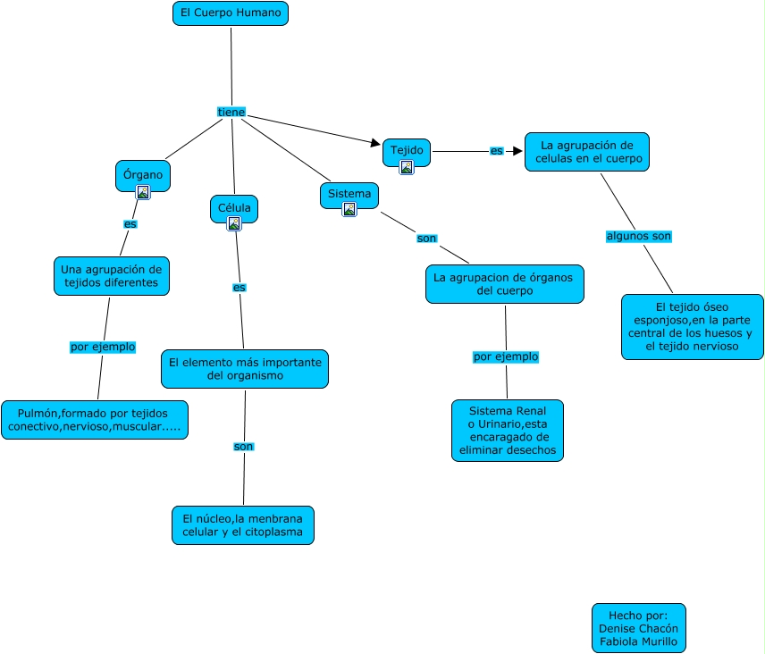 Denise y Fabiola, Tejido es La agrupación de celulas en el cuerpo, El Cuerpo Humano tiene Célula, Sistema son La agrupacion de órganos del cuerpo, El Cuerpo Humano tiene Órgano, La agrupacion de órganos del cuerpo por ejemplo Sistema Renal o Urinario,esta encaragado de eliminar desechos, El Cuerpo Humano tiene Sistema, Célula es El elemento más importante del organismo, El Cuerpo Humano tiene Tejido, Órgano es Una agrupación de tejidos diferentes, El elemento más importante del organismo son El núcleo,la menbrana celular y el citoplasma