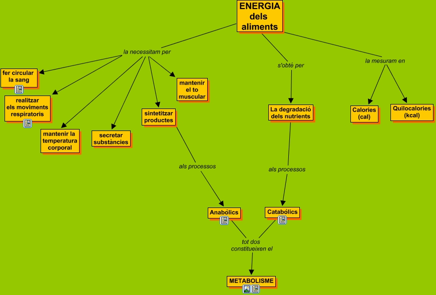 Este mapa conceptual tiene información relacionada a: Energia, ENERGIA dels aliments la necessitam per realitzar els moviments respiratoris, ENERGIA dels aliments la necessitam per secretar substàncies, ENERGIA dels aliments la necessitam per sintetitzar productes, ENERGIA dels aliments s'obté per La degradació dels nutrients, sintetitzar productes als processos Anabòlics, ENERGIA dels aliments la necessitam per mantenir la temperatura corporal, ENERGIA dels aliments la mesuram en Quilocalories (kcal), ENERGIA dels aliments la necessitam per fer circular la sang, Catabòlics tot dos constitueixen el METABOLISME, ENERGIA dels aliments la necessitam per mantenir el to muscular, La degradació dels nutrients als processos Catabòlics, Anabòlics tot dos constitueixen el METABOLISME, ENERGIA dels aliments la mesuram en Calories (cal)