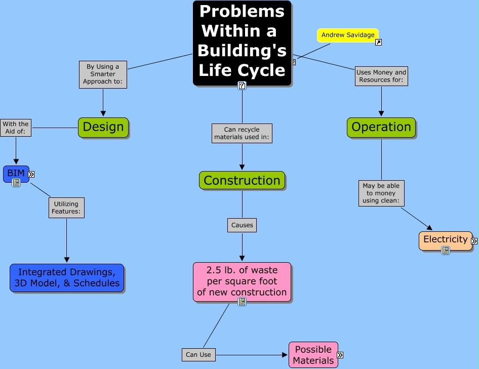 This Concept Map, created with IHMC CmapTools, has information related to: Savidge A2, Problems Within a Building's Life Cycle By Using a Smarter Approach to: Design, Problems Within a Building's Life Cycle Uses Money and Resources for: Operation, Construction Causes 2.5 lb. of waste per square foot of new construction, Andrew Savidage ???? Problems Within a Building's Life Cycle, 2.5 lb. of waste per square foot of new construction Can Use Possible Materials, Design With the Aid of: BIM, BIM Utilizing Features: Integrated Drawings, 3D Model, & Schedules, Operation May be able to money using clean: Electricity, Problems Within a Building's Life Cycle Can recycle materials used in: Construction
