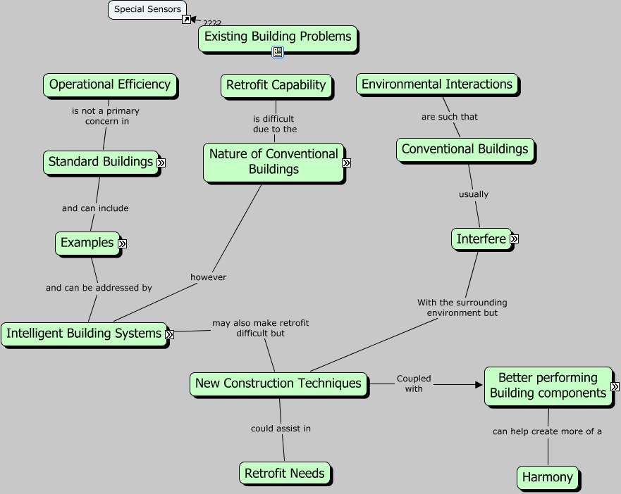 This Concept Map, created with IHMC CmapTools, has information related to: Assign2, New Construction Techniques could assist in Retrofit Needs, New Construction Techniques Coupled with Better performing Building components, Examples and can be addressed by Intelligent Building Systems, Conventional Buildings usually Interfere, Retrofit Capability is difficult due to the Nature of Conventional Buildings, Nature of Conventional Buildings however Intelligent Building Systems, Existing Building Problems ???? Special Sensors, Better performing Building components can help create more of a Harmony, Interfere With the surrounding environment but New Construction Techniques, Environmental Interactions are such that Conventional Buildings, Standard Buildings and can include Examples, Intelligent Building Systems may also make retrofit difficult but New Construction Techniques, Operational Efficiency is not a primary concern in Standard Buildings