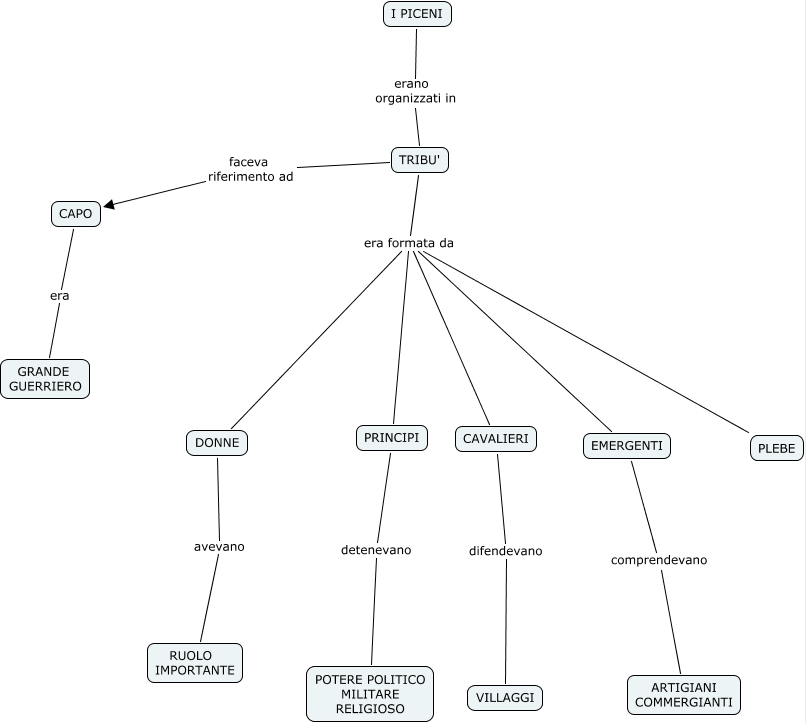 ORGANIZZAZIONE SOCIALE DEI PICENI, TRIBU' era formata da EMERGENTI, TRIBU' era formata da CAVALIERI, TRIBU' faceva riferimento ad CAPO, EMERGENTI comprendevano ARTIGIANI COMMERGIANTI, TRIBU' era formata da PRINCIPI, CAPO era GRANDE GUERRIERO, TRIBU' era formata da DONNE, PRINCIPI detenevano POTERE POLITICO MILITARE RELIGIOSO, CAVALIERI difendevano VILLAGGI, DONNE avevano RUOLO IMPORTANTE