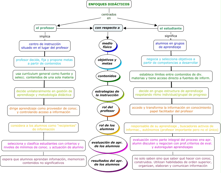 Este Cmap, tiene información relacionada con: enseñanza CP vs enseñanza CE, con respecto a a estrategias de la instrucción, el profesor implica usa currículum general como fuente y selecc. contenidos de una sola materia, el estudiante significa decide en grupo estructura de aprendizaje respetando ritmo individual/grupal de progreso, el profesor implica decide unilateralmente en gestión de aprendizaje y metodología didáctica, con respecto a a rol de los alumnos, con respecto a a rol del profesor, el profesor implica considera a los alumnos como "recipientes" de información, el estudiante significa no solo saben sino que saber qué hacer con conoc. construidos. Utilizan habilidades de orden superior, organizan, elaboran y comunican información, con respecto a a objetivos y metas, el profesor implica dirige aprendizaje como proveedor de conoc. y controlando acceso a información, ENFOQUES DIDÁCTICOS centrados en el profesor, con respecto a a medio físico, el estudiante significa responsable de su aprendizaje , buscadores activos de informac., autónomos (profesor importante pero no el único), el estudiante significa accede y transforma la información en conocimiento papel facilitador del profesor, el estudiante significa alumnos en grupos de aprendizaje, el profesor implica centro de instrucción situado en el lugar del profesor, el estudiante significa establece límites entre contenidos de div. materias y tiene acceso directo a fuentes de inform., ENFOQUES DIDÁCTICOS centrados en el estudiante, el estudiante significa evaluación como parte integral del proceso ens-apr. alumn discuten y negocian con prof.criterios de eval. y autoregulan aprendizajes, el estudiante ???? con respecto a