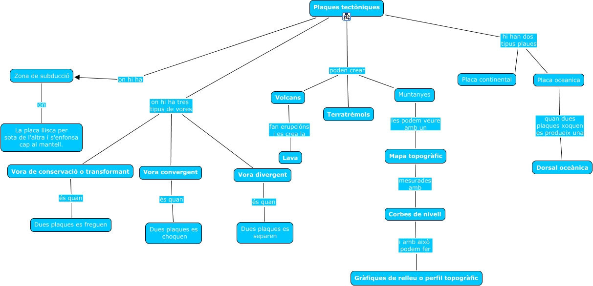 Este mapa conceptual tiene información relacionada a: plaques tectòniques, Plaques tectòniques poden crear Volcans, Plaques tectòniques on hi ha tres tipus de vores Vora de conservació o transformant, Plaques tectòniques poden crear Muntanyes, Plaques tectòniques on hi ha tres tipus de vores Vora convergent, Muntanyes les podem veure amb un Mapa topogràfic, Zona de subducció on La placa llisca per sota de l'altra i s'enfonsa cap al mantell., Plaques tectòniques on hi ha Zona de subducció, Volcans fan erupcións i es crea la Lava, Corbes de nivell i amb això podem fer Gràfiques de relleu o perfil topogràfic, Plaques tectòniques on hi ha tres tipus de vores Vora divergent, Mapa topogràfic mesurades amb Corbes de nivell, Vora divergent és quan Dues plaques es separen, Vora convergent és quan Dues plaques es choquen, Placa oceanica quan dues plaques xoquen es produeix una Dorsal oceànica, Plaques tectòniques hi han dos tipus plaues Placa oceanica, Plaques tectòniques poden crear Terratrèmols, Plaques tectòniques hi han dos tipus plaues Placa continental, Vora de conservació o transformant és quan Dues plaques es freguen