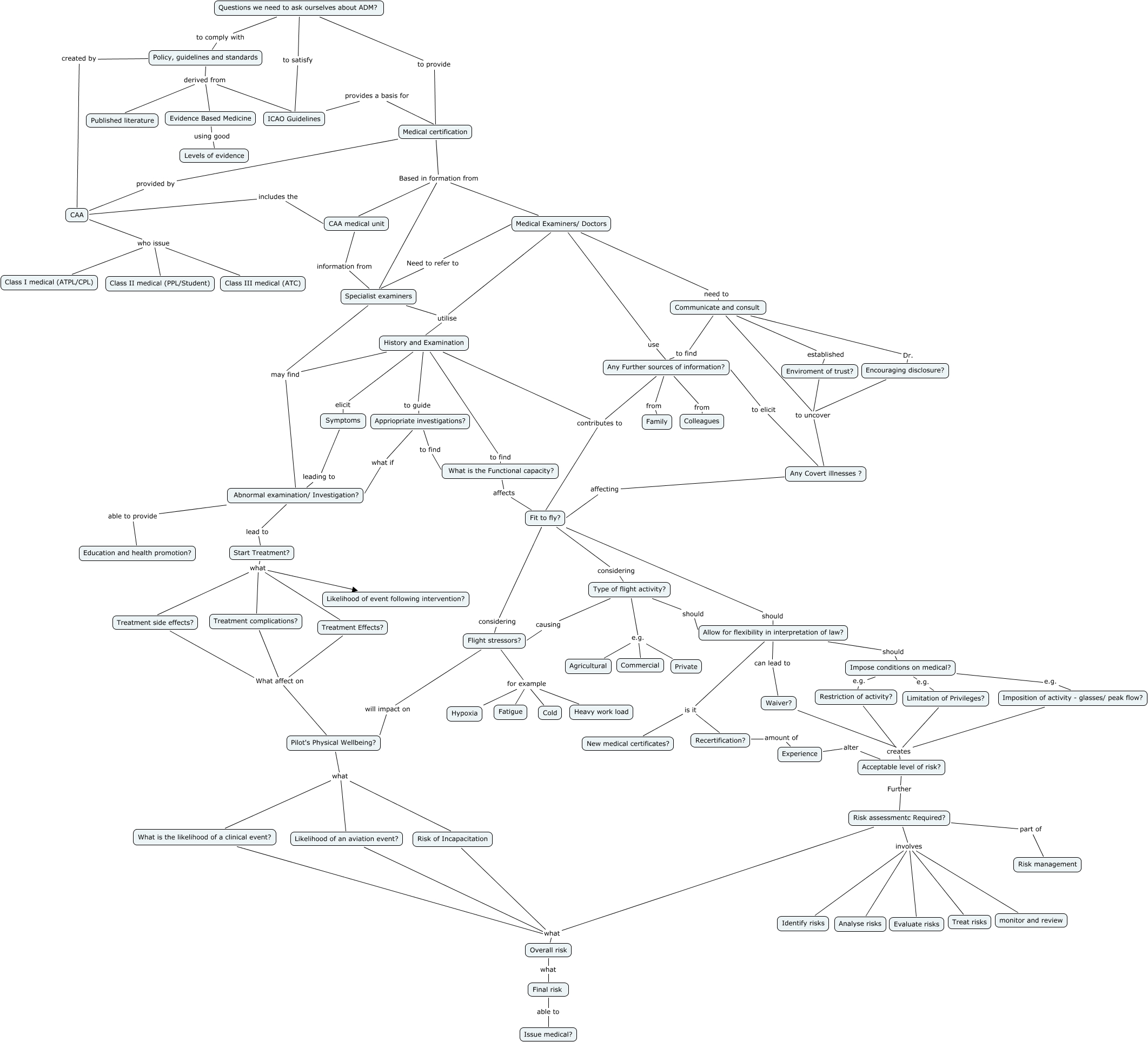 What is risk assessment in aviation - Module 1, Any Further sources of information? from Family, CAA includes the CAA medical unit, Medical certification Based in formation from Specialist examiners, Specialist examiners utilise History and Examination, Type of flight activity? e.g. Private, Medical certification Based in formation from CAA medical unit, Type of flight activity? e.g. Agricultural, ICAO Guidelines provides a basis for Medical certification, Risk assessmentc Required? part of Risk management, History and Examination elicit Symptoms