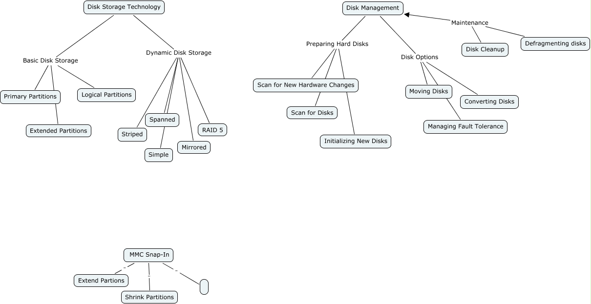 This Concept Map, created with IHMC CmapTools, has information related to: CMChapter4, MMC Snap-In . Extend Partions, Defragmenting disks Maintenance Disk Management, Disk Storage Technology Dynamic Disk Storage Mirrored, Disk Management Preparing Hard Disks Scan for New Hardware Changes, Disk Storage Technology Dynamic Disk Storage RAID 5, Disk Storage Technology Basic Disk Storage Logical Partitions, MMC Snap-In . Shrink Partitions, Disk Management Disk Options Converting Disks, Disk Storage Technology Dynamic Disk Storage Striped, Disk Management Preparing Hard Disks Scan for Disks, Disk Storage Technology Dynamic Disk Storage Simple, Disk Management Preparing Hard Disks Initializing New Disks, Disk Management Disk Options Managing Fault Tolerance, Disk Storage Technology Basic Disk Storage Primary Partitions, MMC Snap-In ., Disk Cleanup Maintenance Disk Management, Disk Management Disk Options Moving Disks, Disk Storage Technology Dynamic Disk Storage Spanned, Disk Storage Technology Basic Disk Storage Extended Partitions