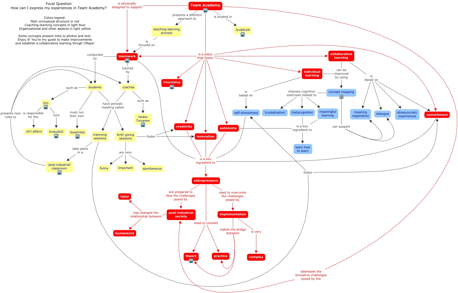 Esse mapa conceitual, produzido no IHMC CmapTools, tem a informação relacionada a: TA_version1, teamwork tutored by coaches, collaborative learning is based on commitment, meaningful learning is a key ingredient to learn how to learn, entrepreneurs need to overcome the challenges posed by implementation, post-industrial society has changed the relationship between labor, autonomy is a key ingredient to entrepreneurs, self-directeness is a key ingredient to entrepreneurs, trainning sessions take place in a 'post-industrial' classroom, Team Academy is located in Jyväskylä, Team Academy addresses the formative challenges posed by the post-industrial society, individual learning is based on self-directeness, commitment is a key ingredient to entrepreneurs, Iiro is responsible for the int'l affairs, teaching-learning process is focused on teamwork, concept mapping imposes cognitive exercises related to meaningful learning, coaches such as Heikki Toivanen, collaborative learning is based on idiossyncratic experiences, Team Academy is a place that foster autonomy, students have periodic meeting called brith giving sessions, entrepreneurs need to connect theory