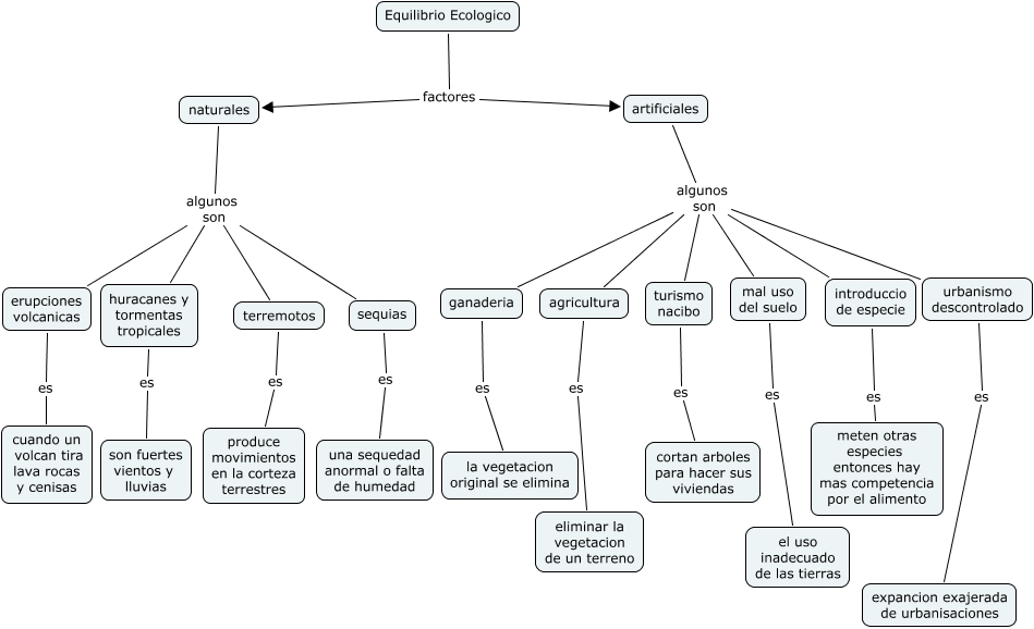 ecosistemas, mal uso del suelo es el uso inadecuado de las tierras, agricultura es eliminar la vegetacion de un terreno, artificiales algunos son mal uso del suelo, Equilibrio Ecologico factores naturales, artificiales algunos son urbanismo descontrolado, naturales algunos son sequias, introduccio de especie es meten otras especies entonces hay mas competencia por el alimento, artificiales algunos son introduccio de especie, ganaderia es la vegetacion original se elimina, artificiales algunos son ganaderia