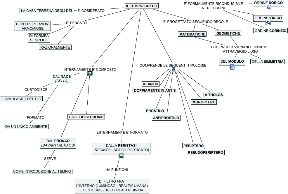 Questa Mappa Concettuale ha informazioni correlate a: 1 - IL TEMPIO GRECO, DAL PRONAO (DAVANTI AL NAOS) SERVE COME INTRODUZIONE AL TEMPIO, IL TEMPIO GRECO COMPRENDE LE SEGUENTI TIPOLOGIE PERIPTERO, IL TEMPIO GRECO COMPRENDE LE SEGUENTI TIPOLOGIE PSEUDOPERIPTERO, IL TEMPIO GRECO COMPRENDE LE SEGUENTI TIPOLOGIE A THOLOS, IL TEMPIO GRECO COMPRENDE LE SEGUENTI TIPOLOGIE MONOPTERO, DAL NAOS (CELLA) CUSTODISCE IL SIMULACRO DEL DIO, IL TEMPIO GRECO COMPRENDE LE SEGUENTI TIPOLOGIE ANFIPROSTILO, IL TEMPIO GRECO E' PENSATO CON PROPORZIONI ARMOMIOSE, IL TEMPIO GRECO E' PENSATO DI FORMEA SEMPLICE, IL TEMPIO GRECO E' PROGETTATO SEGUENDO REGOLE MATEMATICHE, IL TEMPIO GRECO E' FORMALMENTE RICONDUCIBILE A TRE ORDINI ORDINE DORICO, GEOMETICHE CHE PROPORZIONANO L'INSIEME ATTRAVERSO L'USO DELLA SIMMETRIA, GEOMETICHE CHE PROPORZIONANO L'INSIEME ATTRAVERSO L'USO DEL MODULO, IL TEMPIO GRECO INTERNAMENTE E' COMPOSTO DAL NAOS (CELLA), MATEMATICHE CHE PROPORZIONANO L'INSIEME ATTRAVERSO L'USO DELLA SIMMETRIA, IL TEMPIO GRECO INTERNAMENTE E' COMPOSTO DALL' OPISTODOMO, IL TEMPIO GRECO E' PROGETTATO SEGUENDO REGOLE GEOMETICHE, IL TEMPIO GRECO COMPRENDE LE SEGUENTI TIPOLOGIE IN ANTIS, IL TEMPIO GRECO E' COSIDERATO LA CASA TERRENA DEGLI DEI, DALLA PERISTASI (RECINTO - SPAZIO PORTICATO) HA FUNZIONI DI FILTRO FRA L'INTERNO (LUMINOSO - REALTA' UMANA) E L'ESTERNO (BUIO - REALTA' DIVINA)