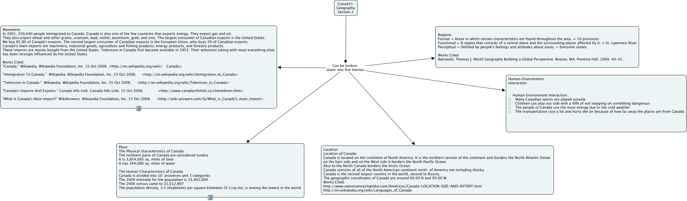 This Concept Map, created with IHMC CmapTools, has information related to: Canada's Geography(2), Canada's Geography Section 2 Can be broken down into five themes Regions Formal = Areas in which certain characteristics are found throughout the area. = 10 provinces Functional = A region that consists of a central place and the surrounding places affected by it. = St. Lawrence River Perceptual = Defined by people's feelings and attitudes about areas. = Everyone skates Works Cited Baerwald, Thomas J. World Geography Building a Global Perspective. Boston, MA: Prentice Hall, 2000. 40-41., Canada's Geography Section 2 Can be broken down into five themes Movement In 2001, 250,640 people immigrated to Canada. Canada is also one of the few countries that exports energy. They export gas and oil. They also export wheat and other grains, uranium, lead, nickel, aluminum, gold, and zinc. The largest consumer of Canadian exports is the United States. We buy 85.8% of Canada's exports. The second largest consumer of Canadian exports is the European Union, who buys 5% of Canadian exports. Canada's main imports are machinery, industrial goods, agriculture and fishing products, energy products, and forestry products. These imports are mostly bought from the United States. Television in Canada first became available in 1952. Their television (along with most everything else) has been strongly influenced by the United States. Works Cited: “Canada.” Wikipedia. Wikipedia Foundation, Inc. 15 Oct 2008. <http://en.wikipedia.org/wiki/ Canada> “Immigration To Canada.” Wikipedia. Wikipedia Foundation, Inc. 15 Oct 2008. <http://en.wikipedia.org/wiki/Immigration_to_Canada> “Television In Canada.” Wikipedia. Wikipedia Foundation, Inc. 15 Oct 2008. <http://en.wikipedia.org/wiki/Television_in_Canada> “Canada's Imports And Exports.” Canada Info Link. Canada Info Link. 15 Oct 2008. <http://www.canadainfolink.ca/charteleven.htm> “What Is Canada's Main Import?” WikiAnswers. Wikipedia Foundation, Inc. 15 Oct 2008. <http://wiki.answers.com/Q/What_is_Canada's_main_import>, Canada's Geography Section 2 Can be broken down into five themes Human-Environment Interaction Human Environment Interaction: Many Canadian sports are played outside Children can play out side with a 99% of not stepping on something dangerous The people in Canada use the most energy due to the cold weather The transportation cost a lot and hurts the air because of how far away the places are from Canada, Canada's Geography Section 2 Can be broken down into five themes Place The Physical characteristics of Canada The northern parts of Canada are considered tundra It is 3,854,085 sq. miles of land It has 344,080 sq. miles of water The Human Characteristics of Canada Canada is divided into 10 provinces and 3 categories The 2008 estimate for the population is 33,402,000 The 2006 census came to 31,612,897 The population density, 3.5 inhabitants per square kilometer (9.1/sq mi), is among the lowest in the world., Canada's Geography Section 2 Can be broken down into five themes Location Location of Canada: Canada is located on the continent of North America. It is the northern section of the continent and borders the North Atlantic Ocean on the East side and on the West side it borders the North Pacific Ocean. Also to the North Canada borders the Arctic Ocean. Canada consists of all of the North American continent north of America not including Alaska. Canada is the second largest country in the world, second to Russia. The geographic coordinates of Canada are around 60.00 N and 95.00 W. Works Cited: http://www.nationsencyclopedia.com/Americas/Canada-LOCATION-SIZE-AND-EXTENT.html http://en.wikipedia.org/wiki/Languages_of_Canada