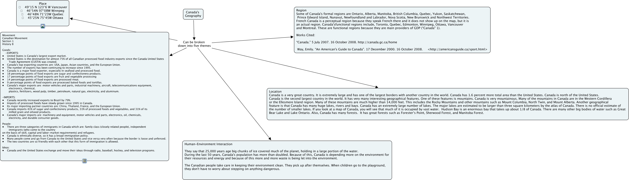 This Concept Map, created with IHMC CmapTools, has information related to: Canada's Geography(1), Canada's Geography Can be broken down into five themes Region Some of Canada's formal regions are Ontario, Alberta, Manitoba, British Columbia, Quebec, Yukon, Saskatchewan, Prince Edward Island, Nunavut, Newfoundland and Labrador, Nova Scotia, New Brunswick and Northwest Territories. French Canada is a perceptual region because they speak French there and it does not show up on the map, but it is an actual region. Canada'sfunctional regions include, Toronto, Quebec, Edmonton, Winnipeg, Ottawa, Vancouver and Montreal. These are functional regions because they are main providers of GDP (“Canada" 1). Works Cited: “Canada.” 5 July 2007. 16 October 2008. http://canada.gc.ca/home Way, Emily. “An American's Guide to Canada”. 17 December 2000. 16 October 2008. <http://americansguide.ca/sport.html>, Canada's Geography Can be broken down into five themes Movement Canadian Movement Section 1 History 8 Goods: -EXPORTS: • United States is Canada's largest export market. • United States is the destination for almost 75% of all Canadian processed food industry exports since the Canada United States Trade Agreement (CUSTA) was created. • Canada's top exporting countries are: USA, Japan, Asian countries, and the European Union. • The number of exports has been continuing to increase since 1995. • Canada is a major food exporter, especially in seafood and processed food. • 18 percentage points of food exports are sugar and confectionery products. • 17 percentage points of food exports are fruit and vegetable processing • 14 percentage points of food exports are processed meat. • 9 percentage points of food exports are processed baked foods and tortillas. • Canada's major exports are: motor vehicles and parts, industrial machinery, aircraft, telecommunications equipment, electronics, chemical, plastics, fertilizers, wood pulp, timber, petroleum, natural gas, electricity, and aluminum. -IMPORTS: • Canada recently increased exports to Brazil by 79%. • Imports of processed foods have slowly grown since 1995 in Canada. • Its major importing partner countries are: China, Thailand, France, and the European Union. • Canada imports 41% of sugar and confectionery products, 31% of processed foods and vegetables, and 31% of its milled grain and oilseed products. • Canada's major imports are: machinery and equipment, motor vehicles and parts, electronics, oil, chemicals, electricity, and durable consumer goods. People: • There are three categories of immigrants in Canada which are: family class (closely related people), independent immigrants (who come to the country on the basis of skill, capital and labor-market requirements) and refugees. • Canada is ethnically diverse, so it has a broad immigration policy. • Many people come and go from Canada to the United States and vice versa very often because the border is loose and unfenced. • The two countries are so friendly with each other that this form of immigration is allowed. Ideas: • Canada and the United States exchange and move their ideas through radio, baseball, hockey, and television programs., Canada's Geography Can be broken down into five themes Human-Environment Interaction They say that 25,000 years age big chunks of ice covered much of the planet, holding in a large portion of the water. During the last 50 years, Canada's population has more than doubled. Because of this, Canada is depending more on the environment for their resources and energy and because of this more and more waste is being let into the environment. The Canadian people take care in keeping their environment clean. They pick up after themselves. When children go to the playground, they don't have to worry about stepping on anything dangerous., Canada's Geography Can be broken down into five themes Place 49°15 N 123°6 W Vancouver 46°54N 97°08W Winnpeg 46°48N 71°23W Quebec 45°25N 75°45W Ottawa, Canada's Geography Can be broken down into five themes Location Canada is a very great country. It is extremely large and has one of the largest borders with another country in the world. Canada has 1.6 percent more total area than the United States. Canada is north of the United States. Canada is the second largest country in the world. It has very many interesting geographical features. One of these features is mountains. Canada is very mountainous. Many of the mountains in Canada are in the Western Cordillera or the Ellesmere Island region. Many of these mountains are much higher than 14,000 feet. This includes the Rocky Mountains and other mountains such as Mount Columbia, North Twin, and Mount Alberta. Another geographical feature is that Canada has many huge lakes, rivers and bays. Canada has an extremely large number of lakes. The major lakes are estimated to be larger than three square kilometers by the atlas of Canada. There is no official estimate of the number of smaller lakes. If you look at a map of Canada, you will see that much of it is occupied by vast water. Hudson Bay is an enormous bay that takes up about 1/8 of Canada. There are many other big bodies of water such as Great Bear Lake and Lake Ontario. Also, Canada has many forests. It has great forests such as Forester’s Point, Sherwood Forest, and Manitoba Forest.