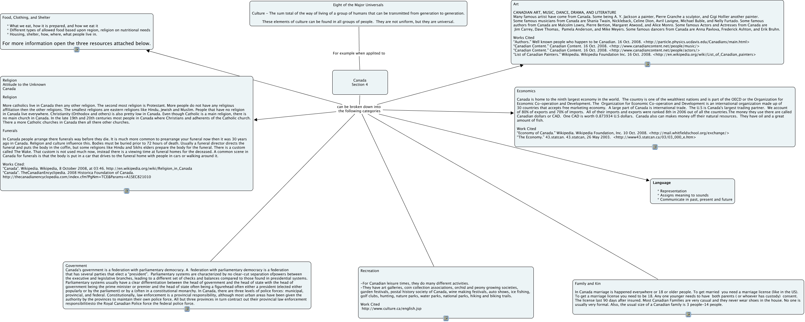 This Concept Map, created with IHMC CmapTools, has information related to: Cultural Universals(4), Eight of the Major Universals Culture - The sum total of the way of living of a group of humans that can be transmitted from generation to generation. These elements of culture can be found in all groups of people. They are not uniform, but they are universal. For example when applited to Canada Section 4, Canada Section 4 can be broken down into the following categories Language * Representation * Assigns meaning to sounds * Communicate in past, present and future, Canada Section 4 can be broken down into the following categories Family and Kin In Canada marriage is happened everywhere or 18 or older people. To get married you need a marriage license (like in the US). To get a marriage license you need to be 18. Any one younger needs to have both parents ( or whoever has custody) consent. The license last 90 days after insured. Most Canadian Families are very casual and they never wear shoes in the house. No one is usually very formal. Also, the usual size of a Canadian family is 3 people-14 people., Canada Section 4 can be broken down into the following categories Food, Clothing, and Shelter * What we eat, how it is prepared, and how we eat it * Different types of allowed food based upon region, religion on nutritional needs * Housing, shelter, how, where, what people live in. For more information open the three resources attached below., Canada Section 4 can be broken down into the following categories Recreation -For Canadian leisure times, they do many different activities. -They have art galleries, coin collection associations, orchid and peony growing societies, garden festivals, postal history society of Canada, wine making festivals, auto shows, ice fishing, golf clubs, hunting, nature parks, water parks, national parks, hiking and biking trails. Work Cited http://www.culture.ca/english.jsp, Canada Section 4 can be broken down into the following categories Religion Attitude to the Unknown Canada Religion More catholics live in Canada then any other religion. The second most religion is Protestant. More people do not have any religious affiliation then the other religions. The smallest religions are eastern religions like Hindu, Jewish and Muslim. People that have no religion in Canada live everywhere. Christianity (Orthodox and others) is also pretty low in Canada. Even though Catholic is a main religion, there is no main church in Canada. In the late 19th and 20th centuries most people in Canada where Christians and adherents of the Catholic church. There a more Catholic churches in Canada then all there other churches. Funerals In Canada people arrange there funerals way before they die. It is much more common to prearrange your funeral now then it was 30 years ago in Canada. Religion and culture influence this. Bodies must be buried prior to 72 hours of death. Usually a funeral director directs the funeral and puts the body in the coffin, but some religions like Hindu and Sikhs elders prepare the body for the funeral. There is a custom called The Wake. That custom is not used much now, instead there is a viewing time at funeral homes for the deceased. A common scene in Canada for funerals is that the body is put in a car that drives to the funeral home with people in cars or walking around it. Works Cited: “Canada”. Wikipedia. Wikipedia, 8 October 2008, at 03:46. http://en.wikipedia.org/wiki/Religion_in_Canada “Canada”. TheCanadianEncyclipedia. 2008 Historica Foundation of Canada. http://thecanadianencyclopedia.com/index.cfm?PgNm=TCE&Params=A1SEC821010, Canada Section 4 can be broken down into the following categories Government Canada's government is a federation with parliamentary democracy. A federation with parliamentary democracy is a federation that has several parties that elect a “president”. Parliamentary systems are characterized by no clear-cut separation ofpowers between the executive and legislative branches, leading to a different set of checks and balances compared to those found in presidential systems. Parliamentary systems usually have a clear differentiation between the head of government and the head of state with the head of government being the prime minister or premier and the head of state often being a figurehead often either a president (elected either popularly or by the parliament) or by a (often in a constitutional monarchy. In Canada, there are three levels of police forces: municipal, provincial, and federal. Constitutionally, law enforcement is a provincial responsibility, although most urban areas have been given the authority by the provinces to maintain their own police force. All but three provinces in turn contract out their provincial law enforcement responsibilitiesto the Royal Canadian Police force the federal police force., Canada Section 4 can be broken down into the following categories Art CANADIAN ART, MUSIC, DANCE, DRAMA, AND LITERATURE Many famous artist have come from Canada. Some being A. Y. Jackson a painter, Pierre Granche a sculptor, and Gigi Hollier another painter. Some famous musicians from Canada are Shania Twain, Nickleback, Celine Dion, Avril Lavigne, Michael Buble, and Nelly Furtado. Some famous authors from Canada are Malcolm Lowry, Pierre Bertion, Margaret Atwood, and Alice Monro. Some famous Actors and Actresses from Canada are Jim Carrey, Dave Thomas, Pamela Anderson, and Mike Meyers. Some famous dancers from Canada are Anna Pavlova, Frederick Ashton, and Erik Bruhn. Works Cited “Authors.” Well known people who happen to be Canadian. 16 Oct. 2008. <http://particle.physics.ucdavis.edu/Canadians/main.html> “Canadian Content.” Canadian Content. 16 Oct. 2008. <http://www.canadiancontent.net/people/music/> “Canadian Content.” Canadian Content. 16 Oct. 2008. <http://www.canadiancontent.net/people/actors/> “List of Canadian Painters.” Wikipedia. Wikipedia Foundation Inc. 16 Oct. 2008. <http://en.
