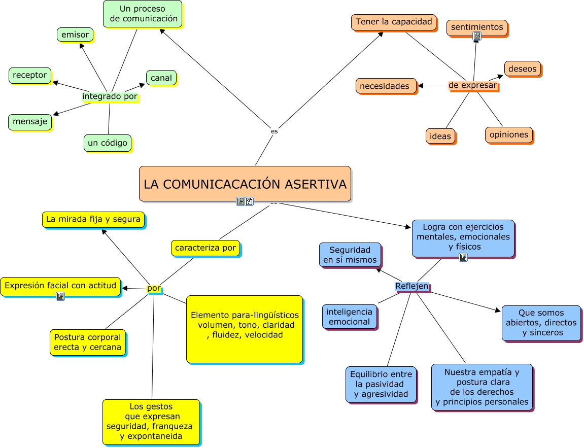 Este mapa conceptual tiene información relacionada a: Comunicación Asertiva, caracteriza por por Postura corporal erecta y cercana, Logra con ejercicios mentales, emocionales y físicos Reflejen Equilibrio entre la pasividad y agresividad, caracteriza por por Elemento para-lingüísticos volumen, tono, claridad , fluidez, velocidad, Logra con ejercicios mentales, emocionales y físicos Reflejen Que somos abiertos, directos y sinceros, Tener la capacidad de expresar sentimientos, Tener la capacidad de expresar deseos, Tener la capacidad de expresar necesidades, LA COMUNICACACIÓN ASERTIVA se Logra con ejercicios mentales, emocionales y físicos, LA COMUNICACACIÓN ASERTIVA es Tener la capacidad, caracteriza por por La mirada fija y segura, Un proceso de comunicación integrado por emisor, Un proceso de comunicación integrado por mensaje, Un proceso de comunicación integrado por canal, Un proceso de comunicación integrado por un código, LA COMUNICACACIÓN ASERTIVA es Un proceso de comunicación, Logra con ejercicios mentales, emocionales y físicos Reflejen Seguridad en sí mismos, LA COMUNICACACIÓN ASERTIVA se caracteriza por, Un proceso de comunicación integrado por receptor, Tener la capacidad de expresar opiniones, Logra con ejercicios mentales, emocionales y físicos Reflejen inteligencia emocional