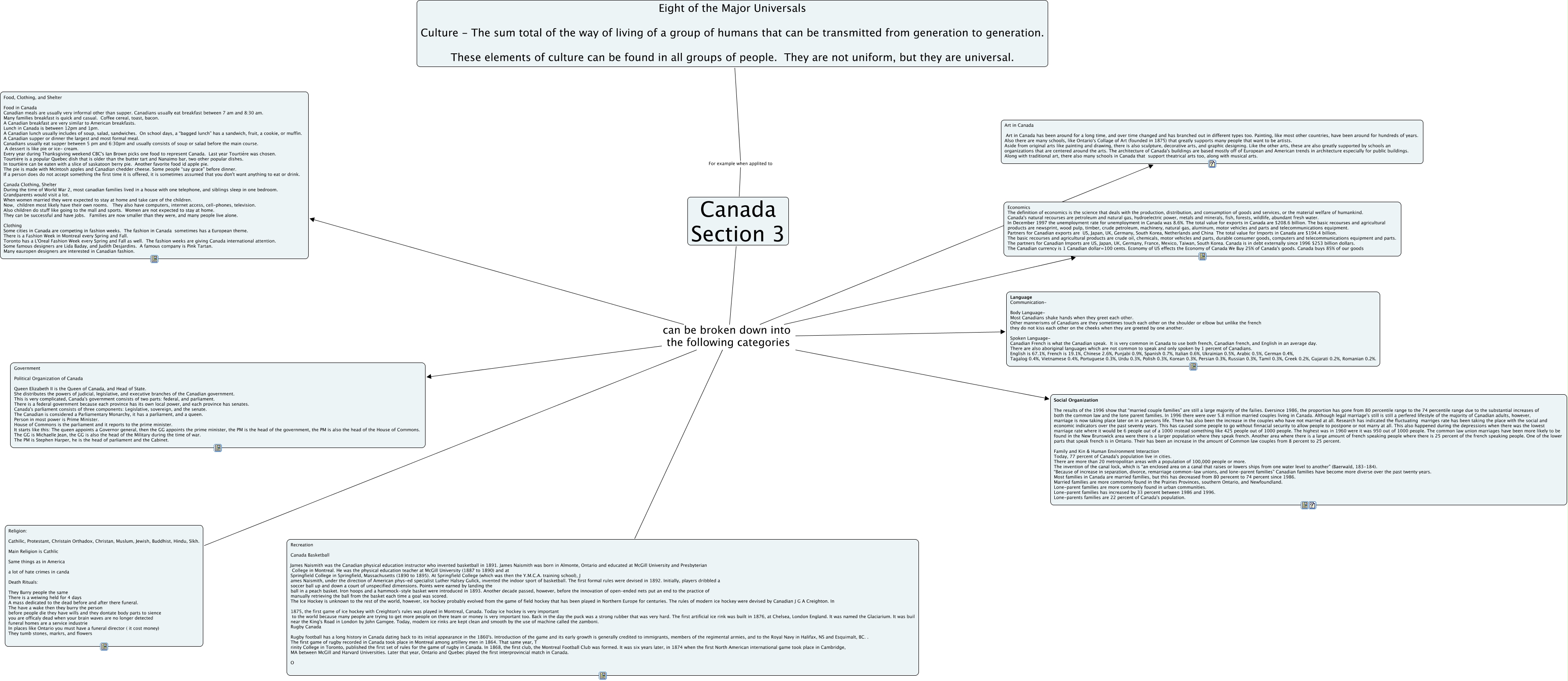 This Concept Map, created with IHMC CmapTools, has information related to: Cultural Universals(3), Canada Section 3 can be broken down into the following categories Government Political Organization of Canada Queen Elizabeth II is the Queen of Canada, and Head of State. She distributes the powers of judicial, legislative, and executive branches of the Canadian government. This is very complicated, Canada's government consists of two parts: federal, and parliament. There is a federal government because each province has its own local power, and each province has senates. Canada's parliament consists of three components: Legislative, sovereign, and the senate. The Canadian is considered a Parliamentary Monarchy, it has a parliament, and a queen. Person in most power is Prime Minister. House of Commons is the parliament and it reports to the prime minister. It starts like this: The queen appoints a Governor general, then the GG appoints the prime minister, the PM is the head of the government, the PM is also the head of the House of Commons. The GG is Michaelle Jean, the GG is also the head of the Military during the time of war. The PM is Stephen Harper, he is the head of parliament and the Cabinet., Canada Section 3 can be broken down into the following categories Economics The definition of economics is the science that deals with the production, distribution, and consumption of goods and services, or the material welfare of humankind. Canada's natural recourses are petroleum and natural gas, hydroelectric power, metals and minerals, fish, forests, wildlife, abundant fresh water. In December 1997 the unemployment rate for unemployment in Canada was 8.6%. The total value for exports in Canada are $208.6 billion. The basic recourses and agricultural products are newsprint, wood pulp, timber, crude petroleum, machinery, natural gas, aluminum, motor vehicles and parts and telecommunications equipment. Partners for Canadian exports are US, Japan, UK, Germany, South Korea, Netherlands and China The total value for Imports in Canada are $194.4 billion. The basic recourses and agricultural products are crude oil, chemicals, motor vehicles and parts, durable consumer goods, computers and telecommunications equipment and parts. The partners for Canadian Imports are US, Japan, UK, Germany, France, Mexico, Taiwan, South Korea. Canada is in debt externally since 1996 $253 billion dollars. The Canadian currency is 1 Canadian dollar=100 cents. Economy of US effects the Economy of Canada We Buy 25% of Canada's goods. Canada buys 85% of our goods, Canada Section 3 can be broken down into the following categories Food, Clothing, and Shelter Food in Canada Canadian meals are usually very informal other than supper. Canadians usually eat breakfast between 7 am and 8:30 am. Many families breakfast is quick and casual. Coffee cereal, toast, bacon. A Canadian breakfast are very similar to American breakfasts. Lunch in Canada is between 12pm and 1pm. A Canadian lunch usually includes of soup, salad, sandwiches. On school days, a “bagged lunch” has a sandwich, fruit, a cookie, or muffin. A Canadian supper or dinner the largest and most formal meal. Canadians usually eat supper between 5 pm and 6:30pm and usually consists of soup or salad before the main course. A dessert is like pie or ice- cream. Every year during Thanksgiving weekend CBC's Ian Brown picks one food to represent Canada. Last year Tourtiére was chosen. Tourtiére is a popular Quebec dish that is older than the butter tart and Nanaimo bar, two other popular dishes. In tourtiére can be eaten with a slice of saskatoon berry pie. Another favorite food id apple pie. The pie is made with McIntosh apples and Canadian chedder cheese. Some people “say grace” before dinner. If a person does do not accept something the first time it is offered, it is sometimes assumed that you don't want anything to eat or drink. Canada Clothing, Shelter During the time of World War 2, most canadian families lived in a house with one telephone, and siblings sleep in one bedroom. Grandparents would visit a lot. When women married they were expected to stay at home and take care of the children. Now, children most likely have their own rooms. They also have computers, internet access, cell-phones, television. Also children do stuff like going to the mall and sports. Women are not expected to stay at home. They can be successful and have jobs. Families are now smaller than they were, and many people live alone. Clothing Some cities in Canada are competing in fashion weeks. The fashion in Canada sometimes has a European theme. There is a Fashion Week in Montreal every Spring and Fall. Toronto has a L'Oreal Fashion Week every Spring and Fall as well. The fashion weeks are giving Canada international attention. Some famous designers are Lida Baday, and Judith Desjardins. A famous company is Pink Tartan. Many eauropen designers are interested in Canadian fashion., Canada Section 3 can be broken down into the following categories Art in Canada Art in Canada has been around for a long time, and over time changed and has branched out in different types too. Painting, like most other countries, have been around for hundreds of years. Also there are many schools, like Ontario's Collage of Art (founded in 1875) that greatly supports many people that want to be artists. Aside from original arts like painting and drawing, there is also sculpture, decorative arts, and graphic designing. Like the other arts, these are also greatly supported by schools an organizations that are centered around the arts. The architecture of Canada's buildings are based mostly off of European and American trends in architecture especially for public buildings. Along with traditional art, there also many schools in Canada that support theatrical arts too, along with musical arts., Eight of the Major Universals Culture - The sum total of the way of living of a group of humans that can be transmitted fr