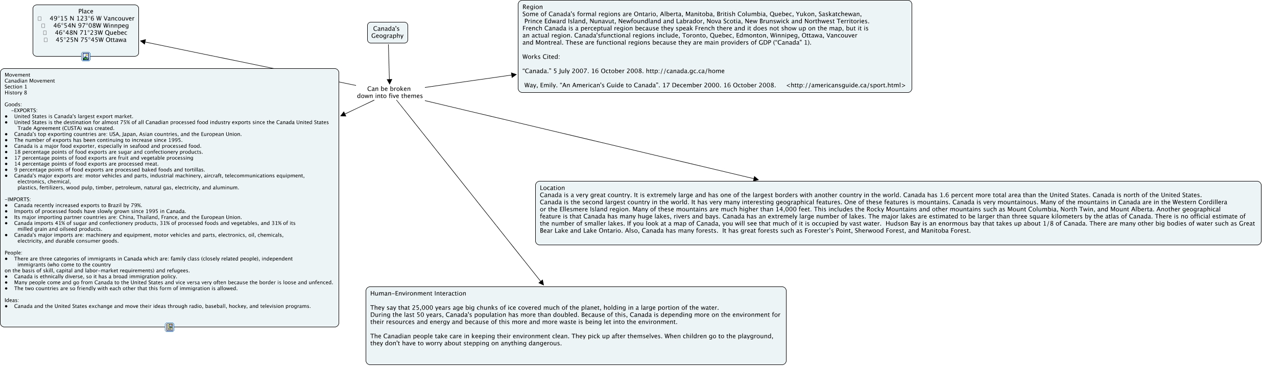 This Concept Map, created with IHMC CmapTools, has information related to: Canada's Geography(1), Canada's Geography Can be broken down into five themes Region Some of Canada's formal regions are Ontario, Alberta, Manitoba, British Columbia, Quebec, Yukon, Saskatchewan, Prince Edward Island, Nunavut, Newfoundland and Labrador, Nova Scotia, New Brunswick and Northwest Territories. French Canada is a perceptual region because they speak French there and it does not show up on the map, but it is an actual region. Canada'sfunctional regions include, Toronto, Quebec, Edmonton, Winnipeg, Ottawa, Vancouver and Montreal. These are functional regions because they are main providers of GDP (“Canada" 1). Works Cited: “Canada.” 5 July 2007. 16 October 2008. http://canada.gc.ca/home Way, Emily. “An American's Guide to Canada”. 17 December 2000. 16 October 2008. <http://americansguide.ca/sport.html>, Canada's Geography Can be broken down into five themes Place 49°15 N 123°6 W Vancouver 46°54N 97°08W Winnpeg 46°48N 71°23W Quebec 45°25N 75°45W Ottawa, Canada's Geography Can be broken down into five themes Human-Environment Interaction They say that 25,000 years age big chunks of ice covered much of the planet, holding in a large portion of the water. During the last 50 years, Canada's population has more than doubled. Because of this, Canada is depending more on the environment for their resources and energy and because of this more and more waste is being let into the environment. The Canadian people take care in keeping their environment clean. They pick up after themselves. When children go to the playground, they don't have to worry about stepping on anything dangerous., Canada's Geography Can be broken down into five themes Movement Canadian Movement Section 1 History 8 Goods: -EXPORTS: • United States is Canada's largest export market. • United States is the destination for almost 75% of all Canadian processed food industry exports since the Canada United States Trade Agreement (CUSTA) was created. • Canada's top exporting countries are: USA, Japan, Asian countries, and the European Union. • The number of exports has been continuing to increase since 1995. • Canada is a major food exporter, especially in seafood and processed food. • 18 percentage points of food exports are sugar and confectionery products. • 17 percentage points of food exports are fruit and vegetable processing • 14 percentage points of food exports are processed meat. • 9 percentage points of food exports are processed baked foods and tortillas. • Canada's major exports are: motor vehicles and parts, industrial machinery, aircraft, telecommunications equipment, electronics, chemical, plastics, fertilizers, wood pulp, timber, petroleum, natural gas, electricity, and aluminum. -IMPORTS: • Canada recently increased exports to Brazil by 79%. • Imports of processed foods have slowly grown since 1995 in Canada. • Its major importing partner countries are: China, Thailand, France, and the European Union. • Canada imports 41% of sugar and confectionery products, 31% of processed foods and vegetables, and 31% of its milled grain and oilseed products. • Canada's major imports are: machinery and equipment, motor vehicles and parts, electronics, oil, chemicals, electricity, and durable consumer goods. People: • There are three categories of immigrants in Canada which are: family class (closely related people), independent immigrants (who come to the country on the basis of skill, capital and labor-market requirements) and refugees. • Canada is ethnically diverse, so it has a broad immigration policy. • Many people come and go from Canada to the United States and vice versa very often because the border is loose and unfenced. • The two countries are so friendly with each other that this form of immigration is allowed. Ideas: • Canada and the United States exchange and move their ideas through radio, baseball, hockey, and television programs., Canada's Geography Can be broken down into five themes Location Canada is a very great country. It is extremely large and has one of the largest borders with another country in the world. Canada has 1.6 percent more total area than the United States. Canada is north of the United States. Canada is the second largest country in the world. It has very many interesting geographical features. One of these features is mountains. Canada is very mountainous. Many of the mountains in Canada are in the Western Cordillera or the Ellesmere Island region. Many of these mountains are much higher than 14,000 feet. This includes the Rocky Mountains and other mountains such as Mount Columbia, North Twin, and Mount Alberta. Another geographical feature is that Canada has many huge lakes, rivers and bays. Canada has an extremely large number of lakes. The major lakes are estimated to be larger than three square kilometers by the atlas of Canada. There is no official estimate of the number of smaller lakes. If you look at a map of Canada, you will see that much of it is occupied by vast water. Hudson Bay is an enormous bay that takes up about 1/8 of Canada. There are many other big bodies of water such as Great Bear Lake and Lake Ontario. Also, Canada has many forests. It has great forests such as Forester’s Point, Sherwood Forest, and Manitoba Forest.