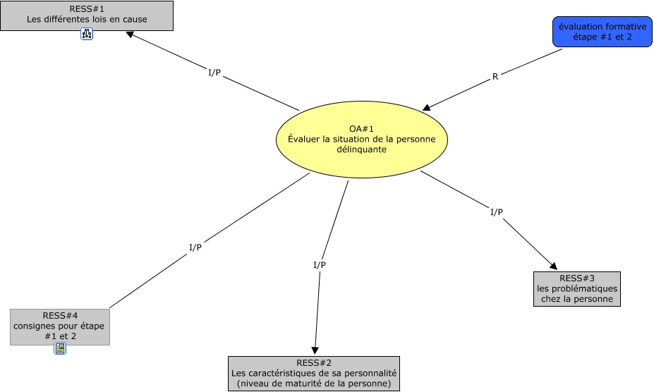 Cette carte conceptuelle, cree avec IHMC CmapTools, contient des informations liees a : OA1, évaluation formative étape #1 et 2 R OA#1 Évaluer la situation de la personne délinquante, OA#1 Évaluer la situation de la personne délinquante I/P RESS#1 Les différentes lois en cause, OA#1 Évaluer la situation de la personne délinquante I/P RESS#3 les problématiques chez la personne, OA#1 Évaluer la situation de la personne délinquante I/P RESS#4 consignes pour étape #1 et 2, OA#1 Évaluer la situation de la personne délinquante I/P RESS#2 Les caractéristiques de sa personnalité (niveau de maturité de la personne)