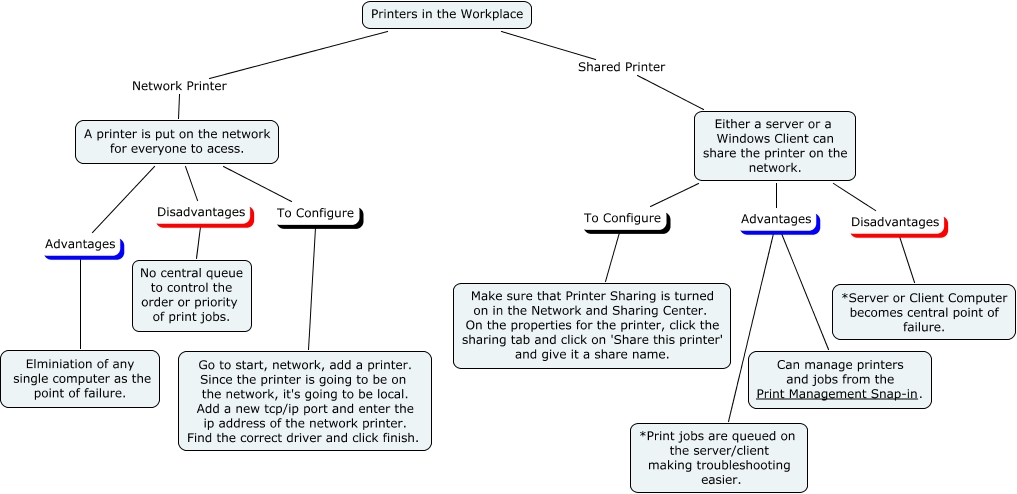 This Concept Map, created with IHMC CmapTools, has information related to: CMPrintersfinished, Either a server or a Windows Client can share the printer on the network. Advantages Can manage printers and jobs from the Print Management Snap-in., Either a server or a Windows Client can share the printer on the network. Advantages *Print jobs are queued on the server/client making troubleshooting easier., Either a server or a Windows Client can share the printer on the network. Disadvantages *Server or Client Computer becomes central point of failure., A printer is put on the network for everyone to acess. Disadvantages No central queue to control the order or priority of print jobs., A printer is put on the network for everyone to acess. To Configure Go to start, network, add a printer. Since the printer is going to be on the network, it's going to be local. Add a new tcp/ip port and enter the ip address of the network printer. Find the correct driver and click finish., Either a server or a Windows Client can share the printer on the network. To Configure Make sure that Printer Sharing is turned on in the Network and Sharing Center. On the properties for the printer, click the sharing tab and click on 'Share this printer' and give it a share name., A printer is put on the network for everyone to acess. Advantages Elminiation of any single computer as the point of failure., Printers in the Workplace Network Printer A printer is put on the network for everyone to acess., Printers in the Workplace Shared Printer Either a server or a Windows Client can share the printer on the network.