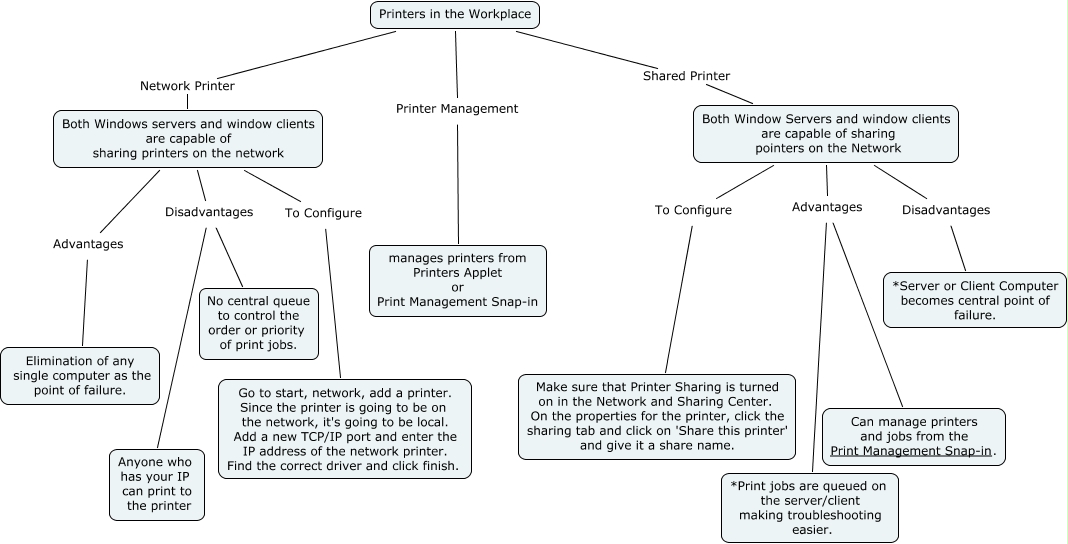 This Concept Map, created with IHMC CmapTools, has information related to: Chapter 10, Both Window Servers and window clients are capable of sharing pointers on the Network Advantages Can manage printers and jobs from the Print Management Snap-in., Both Window Servers and window clients are capable of sharing pointers on the Network Advantages *Print jobs are queued on the server/client making troubleshooting easier., Both Window Servers and window clients are capable of sharing pointers on the Network Disadvantages *Server or Client Computer becomes central point of failure., Printers in the Workplace Printer Management manages printers from Printers Applet or Print Management Snap-in, Both Windows servers and window clients are capable of sharing printers on the network Disadvantages No central queue to control the order or priority of print jobs., Both Window Servers and window clients are capable of sharing pointers on the Network To Configure Make sure that Printer Sharing is turned on in the Network and Sharing Center. On the properties for the printer, click the sharing tab and click on 'Share this printer' and give it a share name., Both Windows servers and window clients are capable of sharing printers on the network To Configure Go to start, network, add a printer. Since the printer is going to be on the network, it's going to be local. Add a new TCP/IP port and enter the IP address of the network printer. Find the correct driver and click finish., Both Windows servers and window clients are capable of sharing printers on the network Disadvantages Anyone who has your IP can print to the printer, Printers in the Workplace Network Printer Both Windows servers and window clients are capable of sharing printers on the network, Both Windows servers and window clients are capable of sharing printers on the network Advantages Elimination of any single computer as the point of failure., Printers in the Workplace Shared Printer Both Window Servers and window clients are capable of sharing pointers on the Network