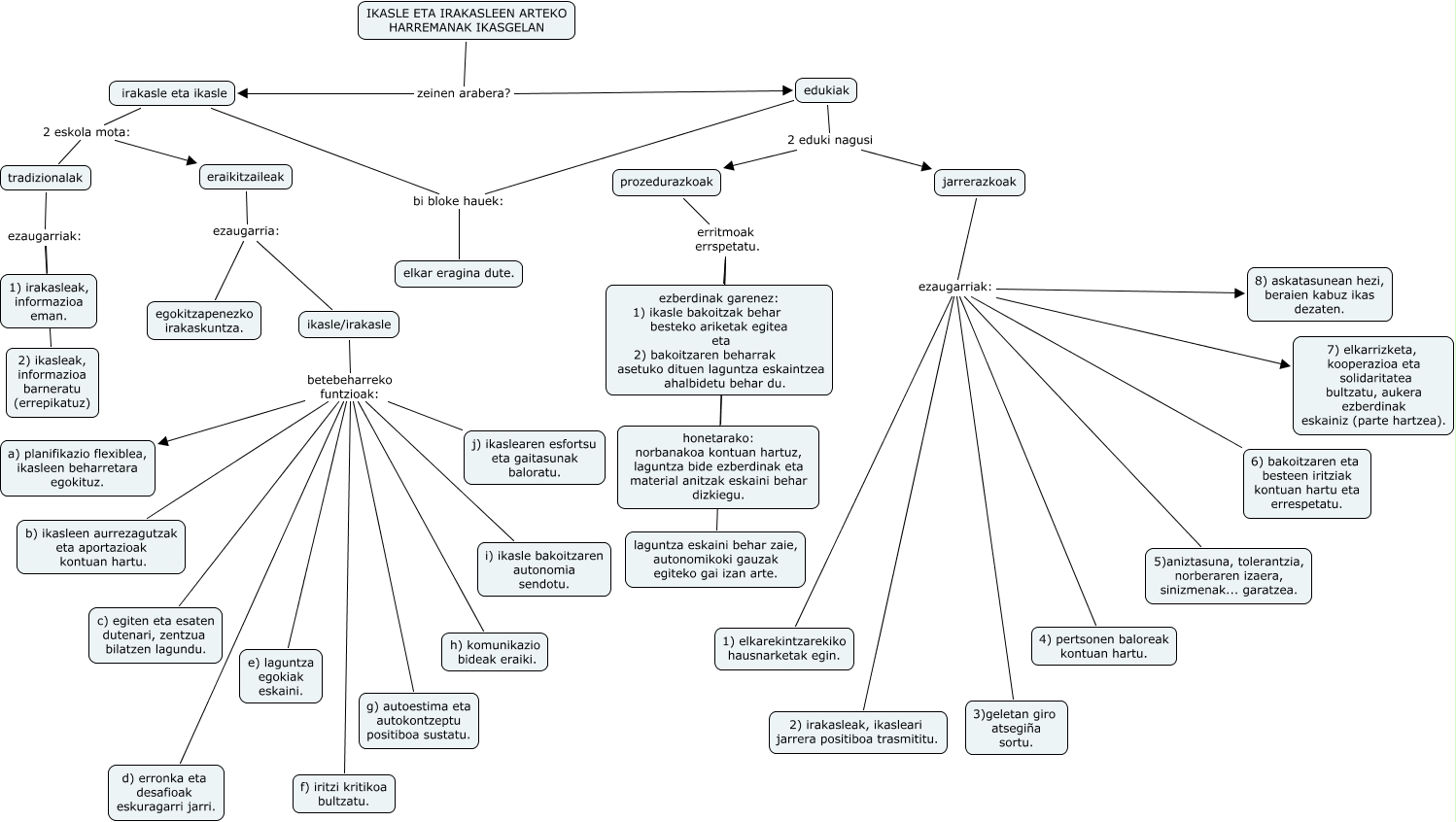 Este Cmap, tiene información relacionada con: garazi2, irakasle eta ikasle 2 eskola mota: eraikitzaileak, tradizionalak ezaugarriak: 2) ikasleak, informazioa barneratu (errepikatuz), ikasle/irakasle betebeharreko funtzioak: g) autoestima eta autokontzeptu positiboa sustatu., prozedurazkoak erritmoak errspetatu. laguntza eskaini behar zaie, autonomikoki gauzak egiteko gai izan arte., ikasle/irakasle betebeharreko funtzioak: e) laguntza egokiak eskaini., prozedurazkoak erritmoak errspetatu. honetarako: norbanakoa kontuan hartuz, laguntza bide ezberdinak eta material anitzak eskaini behar dizkiegu., jarrerazkoak ezaugarriak: 4) pertsonen baloreak kontuan hartu., edukiak 2 eduki nagusi prozedurazkoak, edukiak bi bloke hauek: elkar eragina dute., jarrerazkoak ezaugarriak: 5)aniztasuna, tolerantzia, norberaren izaera, sinizmenak... garatzea., ikasle/irakasle betebeharreko funtzioak: j) ikaslearen esfortsu eta gaitasunak baloratu., ikasle/irakasle betebeharreko funtzioak: i) ikasle bakoitzaren autonomia sendotu., edukiak 2 eduki nagusi jarrerazkoak, ikasle/irakasle betebeharreko funtzioak: f) iritzi kritikoa bultzatu., jarrerazkoak ezaugarriak: 6) bakoitzaren eta besteen iritziak kontuan hartu eta errespetatu., irakasle eta ikasle 2 eskola mota: tradizionalak, IKASLE ETA IRAKASLEEN ARTEKO HARREMANAK IKASGELAN zeinen arabera? edukiak, prozedurazkoak erritmoak errspetatu. ezberdinak garenez: 1) ikasle bakoitzak behar besteko ariketak egitea eta 2) bakoitzaren beharrak asetuko dituen laguntza eskaintzea ahalbidetu behar du., jarrerazkoak ezaugarriak: 3)geletan giro atsegiña sortu., irakasle eta ikasle bi bloke hauek: elkar eragina dute.