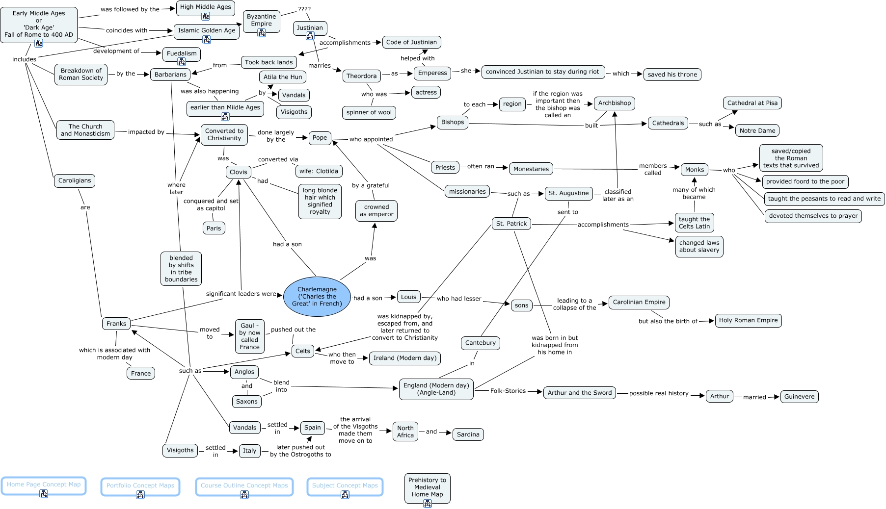 This Concept Map, created with IHMC CmapTools, has information related to: Early Middle Ages, St. Patrick accomplishments changed laws about slavery, Early Middle Ages or 'Dark Age' Fall of Rome to 400 AD includes Byzantine Empire, Took back lands from Barbarians, Emperess helped with Code of Justinian, Clovis had a son Charlemagne ('Charles the Great' in French), Cathedrals such as Cathedral at Pisa, earlier than Miidle Ages by Vandals, St. Patrick was born in but kidnapped from his home in England (Modern day) (Angle-Land), Monestaries members called Monks, Justinian accomplishments Code of Justinian, Anglos and Saxons, earlier than Miidle Ages by Atila the Hun, Theordora as Emperess, North Africa and Sardina, Charlemagne ('Charles the Great' in French) had a son Louis, Cantebury in England (Modern day) (Angle-Land), blended by shifts in tribe boundaries such as Franks, Saxons blend into England (Modern day) (Angle-Land), Early Middle Ages or 'Dark Age' Fall of Rome to 400 AD includes Breakdown of Roman Society, Theordora who was actress