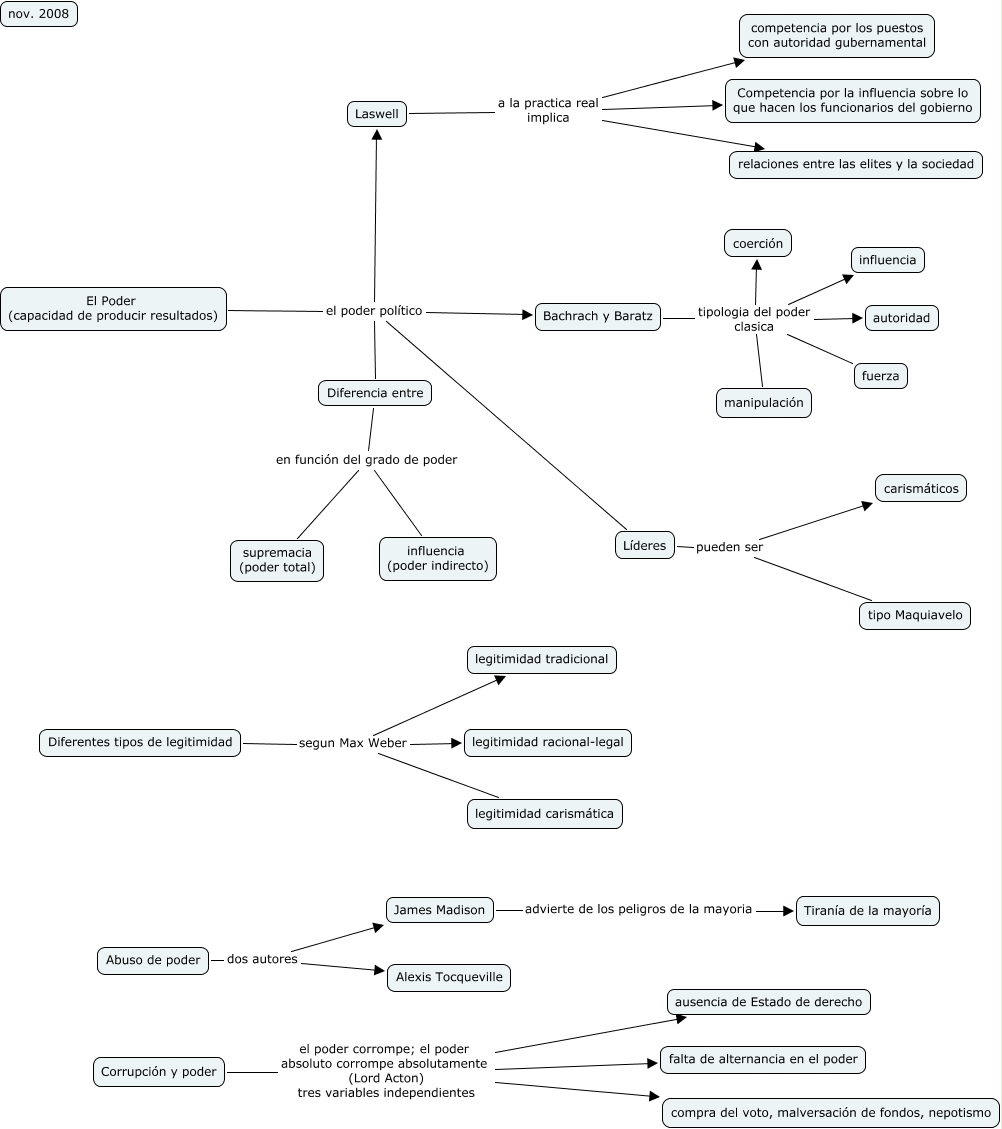 Este Cmap, tiene información relacionada con: Tema 5 Introducció a la Ciencia Política, Corrupción y poder el poder corrompe; el poder absoluto corrompe absolutamente (Lord Acton) tres variables independientes ausencia de Estado de derecho, El Poder (capacidad de producir resultados) el poder político Líderes, Diferentes tipos de legitimidad segun Max Weber legitimidad racional-legal, Bachrach y Baratz tipologia del poder clasica fuerza, Abuso de poder dos autores James Madison, Laswell a la practica real implica competencia por los puestos con autoridad gubernamental, Bachrach y Baratz tipologia del poder clasica coerción, Laswell a la practica real implica relaciones entre las elites y la sociedad, Corrupción y poder el poder corrompe; el poder absoluto corrompe absolutamente (Lord Acton) tres variables independientes compra del voto, malversación de fondos, nepotismo, Líderes pueden ser tipo Maquiavelo, Corrupción y poder el poder corrompe; el poder absoluto corrompe absolutamente (Lord Acton) tres variables independientes falta de alternancia en el poder, Diferencia entre en función del grado de poder influencia (poder indirecto), El Poder (capacidad de producir resultados) el poder político Diferencia entre, Abuso de poder dos autores Alexis Tocqueville, Laswell a la practica real implica Competencia por la influencia sobre lo que hacen los funcionarios del gobierno, Líderes pueden ser carismáticos, James Madison advierte de los peligros de la mayoria Tiranía de la mayoría, Diferencia entre en función del grado de poder supremacia (poder total), Bachrach y Baratz tipologia del poder clasica manipulación, Diferentes tipos de legitimidad segun Max Weber legitimidad carismática
