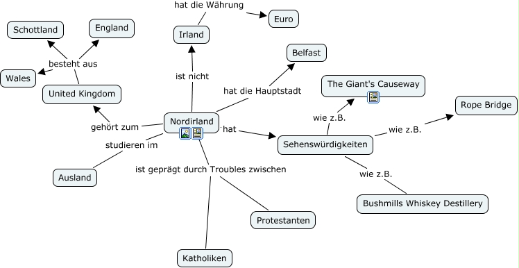 Dieses mit IHMC CmapTools erstellte CMap hat Informationen bezüglich: Nordirland, Nordirland hat die Hauptstadt Belfast, Irland hat die Währung Euro, United Kingdom besteht aus England, United Kingdom besteht aus Wales, Nordirland ist geprägt durch Troubles zwischen Katholiken, Sehenswürdigkeiten wie z.B. Bushmills Whiskey Destillery, Nordirland gehört zum United Kingdom, United Kingdom besteht aus Schottland, Sehenswürdigkeiten wie z.B. The Giant's Causeway, Sehenswürdigkeiten wie z.B. Rope Bridge, Nordirland ist nicht Irland, Nordirland ist geprägt durch Troubles zwischen Protestanten, Nordirland studieren im Ausland, Nordirland hat Sehenswürdigkeiten