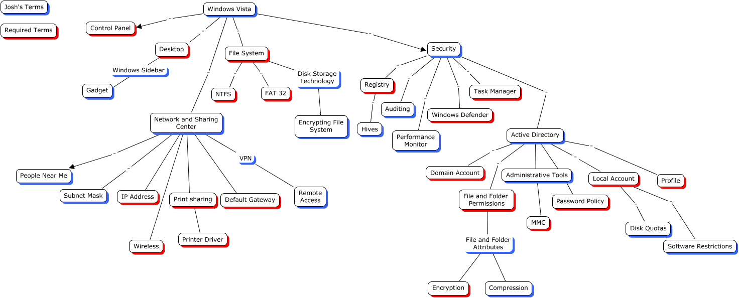 This Concept Map, created with IHMC CmapTools, has information related to: Josh Final CMAP finished, Windows Vista . Security, Windows Vista . File System, Registry . Hives, Security . Registry, Print sharing . Printer Driver, Active Directory . File and Folder Permissions, Security . Task Manager, Network and Sharing Center VPN Remote Access, Active Directory . Administrative Tools, Windows Vista . Desktop, Active Directory . Local Account, Active Directory . Password Policy, Network and Sharing Center . Wireless, Security . Auditing, Network and Sharing Center . Print sharing, Windows Vista . Control Panel, File System Disk Storage Technology Encrypting File System, Security . Windows Defender, Network and Sharing Center . Default Gateway, Active Directory . Profile