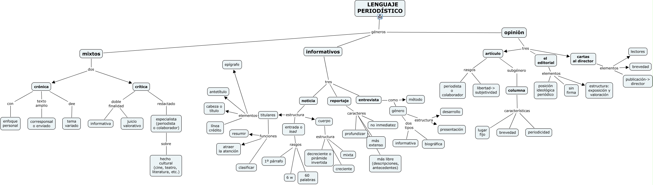 Este Cmap, tiene información relacionada con: periodístico2, cartas al director elementos lectores, titulares funciones clasificar, reportaje caracteres no inmediatez, columna características lugar fijo, noticia estructura cuerpo, opinión tres artículo, reportaje caracteres más libre (descripciones, antecedentes), crítica doble finalidad informativa, LENGUAJE PERIODÍSTICO géneros opinión, crítica doble finalidad juicio valorativo, entrada o lead rasgos 1º párrafo, opinión tres el editorial, cartas al director elementos publicación-> director, LENGUAJE PERIODÍSTICO géneros mixtos, informativos tres entrevista, género estructura presentación, noticia estructura entrada o lead, el editorial elementos posición ideológica periódico, titulares elementos epígrafe, opinión tres cartas al director