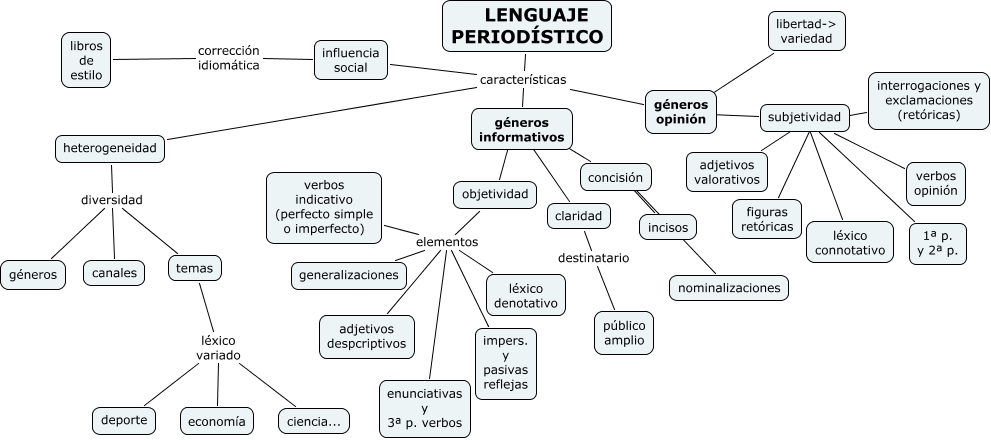 Este Cmap, tiene información relacionada con: periodístico3, heterogeneidad diversidad canales, objetividad elementos enunciativas y 3ª p. verbos, subjetividad ???? interrogaciones y exclamaciones (retóricas), géneros informativos ???? claridad, temas léxico variado deporte, temas léxico variado ciencia..., claridad destinatario público amplio, subjetividad ???? léxico connotativo, temas léxico variado economía, objetividad elementos verbos indicativo (perfecto simple o imperfecto), objetividad elementos generalizaciones, concisión ???? nominalizaciones, géneros informativos ???? concisión, géneros opinión ???? libertad-> variedad, géneros informativos ???? objetividad, objetividad elementos léxico denotativo, subjetividad ???? adjetivos valorativos, LENGUAJE PERIODÍSTICO características heterogeneidad, LENGUAJE PERIODÍSTICO características géneros informativos, LENGUAJE PERIODÍSTICO características influencia social