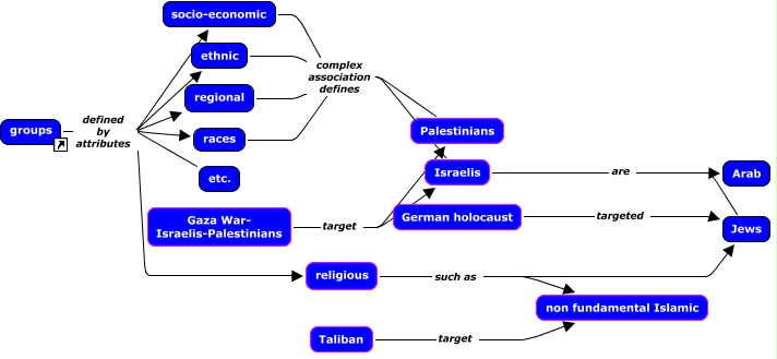 groups rh, Israelis are Arab, Gaza War- Israelis-Palestinians target Israelis, religious such as Jews, socio-economic complex association defines Israelis, Gaza War- Israelis-Palestinians target Palestinians, Taliban target non fundamental Islamic, religious such as non fundamental Islamic, races complex association defines Palestinians, groups defined by attributes socio-economic, groups defined by attributes regional
