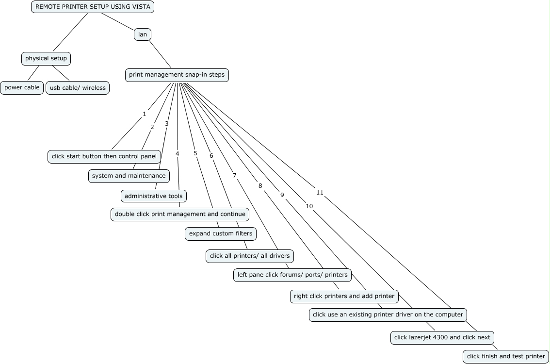 This Concept Map, created with IHMC CmapTools, has information related to: chapter10, REMOTE PRINTER SETUP USING VISTA . lan, print management snap-in steps 7 left pane click forums/ ports/ printers, print management snap-in steps 2 system and maintenance, print management snap-in steps 9 click use an existing printer driver on the computer, REMOTE PRINTER SETUP USING VISTA . physical setup, physical setup ???? usb cable/ wireless, lan . print management snap-in steps, print management snap-in steps 11 click finish and test printer, print management snap-in steps 6 click all printers/ all drivers, print management snap-in steps 3 administrative tools, print management snap-in steps 5 expand custom filters, print management snap-in steps 10 click lazerjet 4300 and click next, print management snap-in steps 4 double click print management and continue, print management snap-in steps 8 right click printers and add printer, print management snap-in steps 1 click start button then control panel, physical setup ???? power cable