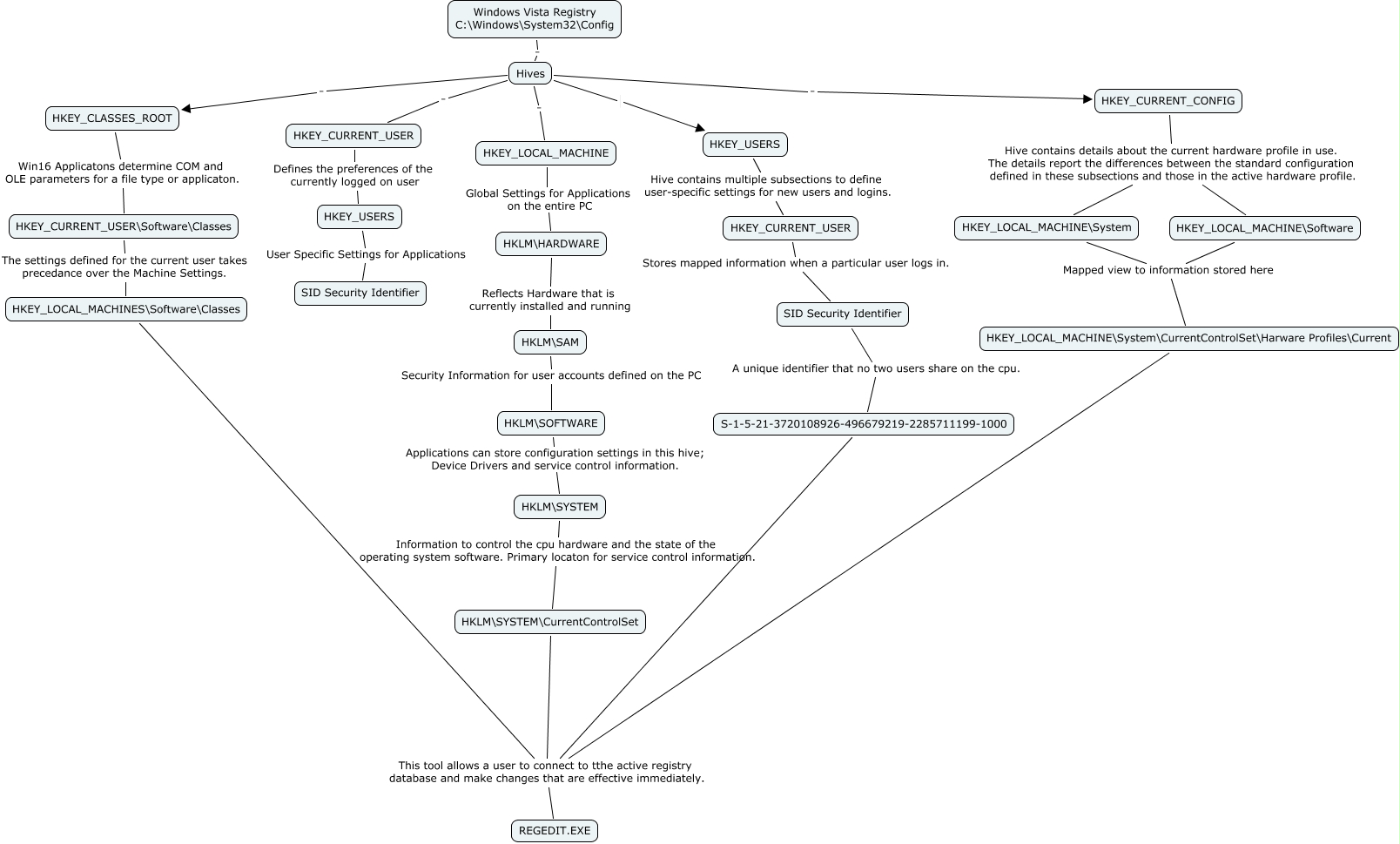 This Concept Map, created with IHMC CmapTools, has information related to: Windows Vista Registry, HKEY_LOCAL_MACHINE\Software Mapped view to information stored here HKEY_LOCAL_MACHINE\System\CurrentControlSet\Harware Profiles\Current, HKLM\SOFTWARE Applications can store configuration settings in this hive; Device Drivers and service control information. HKLM\SYSTEM, HKEY_CURRENT_USER\Software\Classes The settings defined for the current user takes precedance over the Machine Settings. HKEY_LOCAL_MACHINES\Software\Classes, HKEY_CURRENT_CONFIG Hive contains details about the current hardware profile in use. The details report the differences between the standard configuration defined in these subsections and those in the active hardware profile. HKEY_LOCAL_MACHINE\System, HKEY_LOCAL_MACHINE\System Mapped view to information stored here HKEY_LOCAL_MACHINE\System\CurrentControlSet\Harware Profiles\Current, HKEY_CURRENT_USER Defines the preferences of the currently logged on user HKEY_USERS, HKEY_LOCAL_MACHINE\System\CurrentControlSet\Harware Profiles\Current This tool allows a user to connect to tthe active registry database and make changes that are effective immediately. REGEDIT.EXE, Hives . HKEY_CURRENT_CONFIG, HKEY_USERS User Specific Settings for Applications SID Security Identifier, HKLM\SYSTEM Information to control the cpu hardware and the state of the operating system software. Primary locaton for service control information. HKLM\SYSTEM\CurrentControlSet, HKEY_CLASSES_ROOT Win16 Applicatons determine COM and OLE parameters for a file type or applicaton. HKEY_CURRENT_USER\Software\Classes, HKEY_LOCAL_MACHINE Global Settings for Applications on the entire PC HKLM\HARDWARE, Hives . HKEY_LOCAL_MACHINE, HKLM\HARDWARE Reflects Hardware that is currently installed and running HKLM\SAM, Windows Vista Registry C:\Windows\System32\Config . Hives, HKEY_CURRENT_USER Stores mapped information when a particular user logs in. SID Security Identifier, Hives . HKEY_CURRENT_USER, HKEY_LOCAL_MACHINES\Software\Classes This tool allows a user to connect to tthe active registry database and make changes that are effective immediately. REGEDIT.EXE, HKEY_USERS Hive contains multiple subsections to define user-specific settings for new users and logins. HKEY_CURRENT_USER, Hives HKEY_USERS