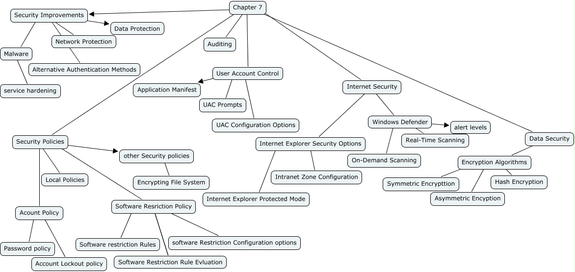 This Concept Map, created with IHMC CmapTools, has information related to: DAJChapter_7, Encryption Algorithms ???? Symmetric Encrypttion, Software Resriction Policy ???? software Restriction Configuration options, other Security policies ???? Encrypting File System, Windows Defender ???? Real-Time Scanning, Chapter 7 ???? Auditing, Acount Policy ???? Password policy, Chapter 7 ???? User Account Control, Internet Explorer Security Options ???? Internet Explorer Protected Mode, Internet Security ???? Windows Defender, Internet Explorer Security Options ???? Intranet Zone Configuration, User Account Control ???? Application Manifest, Data Security ???? Encryption Algorithms, Encryption Algorithms ???? Hash Encryption, Internet Security ???? Internet Explorer Security Options, Acount Policy ???? Account Lockout policy, Windows Defender ???? alert levels, Software Restriction Rule Evluation ???? Software Resriction Policy, Chapter 7 ???? Data Security, Chapter 7 ???? Security Improvements, Security Improvements ???? Alternative Authentication Methods