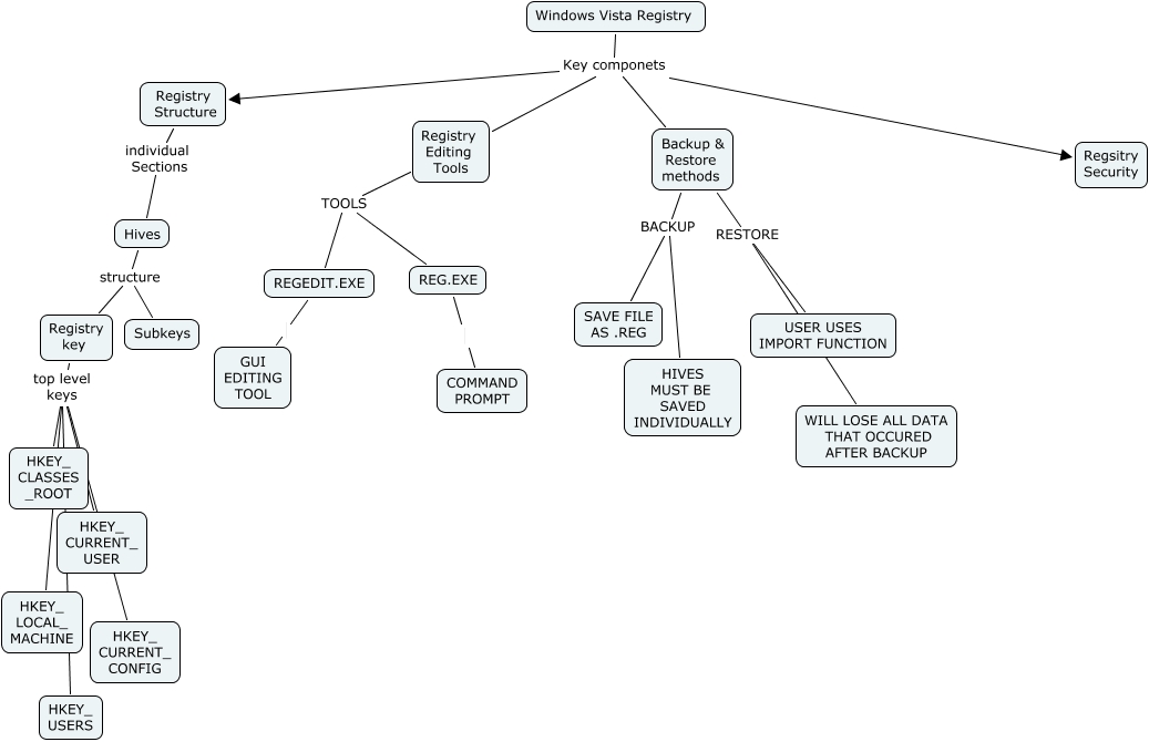 This Concept Map, created with IHMC CmapTools, has information related to: 12-REGISTRY, Hives structure Subkeys, Registry key top level keys HKEY_ LOCAL_ MACHINE, Registry key top level keys HKEY_ USERS, Registry Structure individual Sections Hives, Backup & Restore methods BACKUP HIVES MUST BE SAVED INDIVIDUALLY, Registry key top level keys HKEY_ CURRENT_ USER, Registry Editing Tools TOOLS REG.EXE, Backup & Restore methods RESTORE USER USES IMPORT FUNCTION, Windows Vista Registry Key componets Backup & Restore methods, Registry key top level keys HKEY_ CURRENT_ CONFIG, Backup & Restore methods BACKUP SAVE FILE AS .REG, REG.EXE COMMAND PROMPT, Windows Vista Registry Key componets Registry Editing Tools, Windows Vista Registry Key componets Regsitry Security, Backup & Restore methods RESTORE WILL LOSE ALL DATA THAT OCCURED AFTER BACKUP, Registry Editing Tools TOOLS REGEDIT.EXE, Registry key top level keys HKEY_ CLASSES _ROOT, Hives structure Registry key, Windows Vista Registry Key componets Registry Structure, REGEDIT.EXE GUI EDITING TOOL