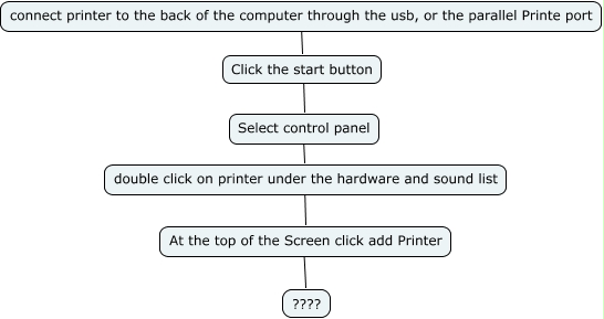 This Concept Map, created with IHMC CmapTools, has information related to: Chapter 10, Click the start button ???? Select control panel, At the top of the Screen click add Printer ???? ????, Select control panel ???? double click on printer under the hardware and sound list, double click on printer under the hardware and sound list ???? At the top of the Screen click add Printer, connect printer to the back of the computer through the usb, or the parallel Printe port ???? Click the start button