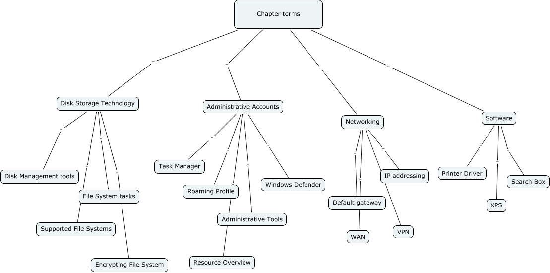 This Concept Map, created with IHMC CmapTools, has information related to: Key Terms for Final, Chapter terms . Administrative Accounts, Networking . WAN, Networking . IP addressing, Disk Storage Technology . Disk Management tools, Administrative Accounts . Windows Defender, Networking . Default gateway, Software . Printer Driver, Disk Storage Technology . File System tasks, Chapter terms . Software, Administrative Accounts . Roaming Profile, Software . XPS, Administrative Accounts . Resource Overview, Disk Storage Technology . Supported File Systems, Disk Storage Technology . Encrypting File System, Administrative Accounts . Task Manager, Software . Search Box, Networking . VPN, Administrative Accounts . Administrative Tools, Chapter terms . Disk Storage Technology, Chapter terms . Networking