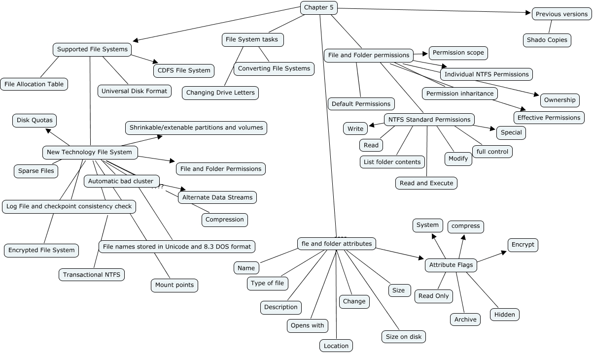 This Concept Map, created with IHMC CmapTools, has information related to: DAJChapter_5, Chapter 5 ???? fle and folder attributes, Supported File Systems ???? Universal Disk Format, NTFS Standard Permissions ???? Read and Execute, fle and folder attributes ???? Description, File System tasks ???? Converting File Systems, New Technology File System ???? File and Folder Permissions, Chapter 5 ???? Supported File Systems, Chapter 5 ???? File System tasks, NTFS Standard Permissions ???? Read, Attribute Flags ???? Encrypt, New Technology File System ???? Encrypted File System, File and Folder permissions ???? Ownership, fle and folder attributes ???? Opens with, Chapter 5 ???? File and Folder permissions, Attribute Flags ???? System, fle and folder attributes ???? Attribute Flags, New Technology File System ???? Disk Quotas, fle and folder attributes ???? Size on disk, Attribute Flags ???? Read Only, NTFS Standard Permissions ???? Modify