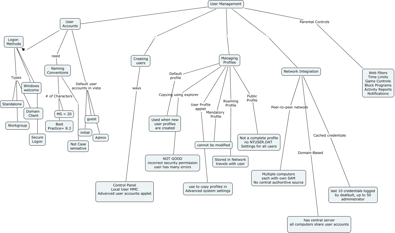 This Concept Map, created with IHMC CmapTools, has information related to: Chapter6-userManagement, User Management . Network Integration, Logon Methods Types Domain Client, Creating users ways Control Panel Local User MMC Advanced user accounts applet, User Accounts Default user accounts in vista Admin, User Management Parental Controls Web filters Time Limits Game Controls Block Programs Activity Reports Notifications, Managing Profiles Public Profile Not a complete profile no NTUSER.DAT Settings for all users, Managing Profiles Default profile Used when new user profiles are created, User Accounts Default user accounts in vista guest, Logon Methods Types Standalone, Naming Conventions # of Characters MS = 20, Managing Profiles Copying using explorer NOT GOOD incorrect security permission user has many errors, Network Integration Domain-Based has central server all computers share user accounts, Network Integration Peer-to-peer network Multiple computers each with own SAM No central authoritive source, Managing Profiles Mandatory Profile cannot be modified, Managing Profiles Roaming Profile Stored in Network travels with user, User Management . User Accounts, Naming Conventions . Not Case sensative, Naming Conventions # of Characters Best Practice= 8.3, User Management . Managing Profiles, Network Integration Cached credentials last 10 credentials logged by deafault, up to 50 administrator