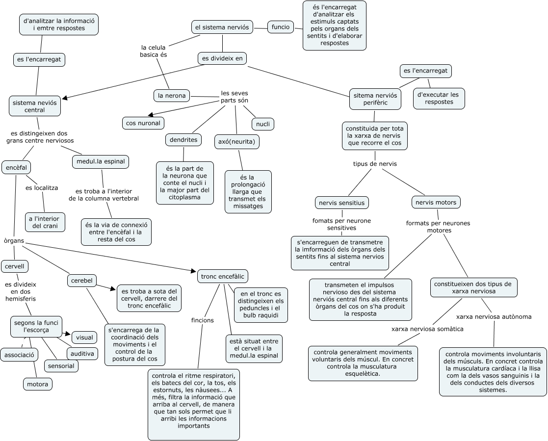 Este mapa conceptual tiene información relacionada a: Sin Título 2, sistema neviós central es distingeixen dos grans centre nerviosos encèfal, es divideix en ???? sitema nerviós perifèric, segons la funci l'escorça associació, la nerona les seves parts són cos nuronal, encèfal òrgans cervell, segons la funci l'escorça ???? motora, dendrites ???? és la part de la neurona que conte el nucli i la major part del citoplasma, segons la funci l'escorça ???? visual, nervis motors formats per neurones motores transmeten el impulsos nervioso des del sistema nerviós central fins als diferents òrgans del cos on s'ha produit la resposta, es l'encarregat d'ex d'executar les respostes, sitema nerviós perifèric ???? es l'encarregat, tronc encefàlic ???? està situat entre el cervell i la medul.la espinal, cerebel ???? es troba a sota del cervell, darrere del tronc encefàlic, sistema neviós central es distingeixen dos grans centre nerviosos medul.la espinal, sistema neviós central ???? es l'encarregat, constitueixen dos tipus de xarxa nerviosa xarxa nerviosa somàtica controla generalment moviments voluntaris dels múscul. En concret controla la musculatura esquelètica., es divideix en sis sistema neviós central, encèfal òrgans cerebel, axó(neurita) ???? és la prolongació llarga que transmet els missatges, la nerona les seves parts són axó(neurita)