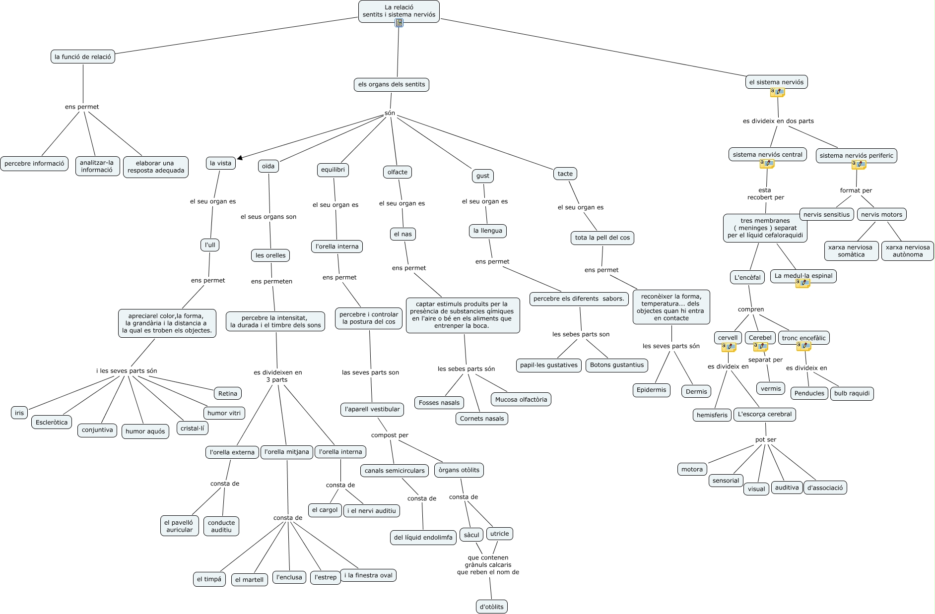 Este Cmap, tiene información relacionada con: tema4 ( diana ), Retina i les seves parts són iris, la llengua ens permet percebre els diferents sabors., l'orella interna consta de el cargol, La relació sentits i sistema nerviós ???? el sistema nerviós, apreciarel color,la forma, la grandària i la distancia a la qual es troben els objectes. i les seves parts són cristal·lí, Retina i les seves parts són conjuntiva, sàcul que contenen grànuls calcaris que reben el nom de d'otòlits, l'orella mitjana consta de el martell, el sistema nerviós es divideix en dos parts sistema nerviós periferic, les orelles ens permeten percebre la intensitat, la durada i el timbre dels sons, gust el seu organ es la llengua, l'orella mitjana consta de i la finestra oval, la funció de relació ens permet analitzar-la informació, nervis motors ???? xarxa nerviosa autònoma, apreciarel color,la forma, la grandària i la distancia a la qual es troben els objectes. i les seves parts són iris, gust són oïda, L'encèfal compren tronc encefàlic, tacte el seu organ es tota la pell del cos, canals semicirculars consta de del líquid endolimfa, utricle que contenen grànuls calcaris que reben el nom de d'otòlits