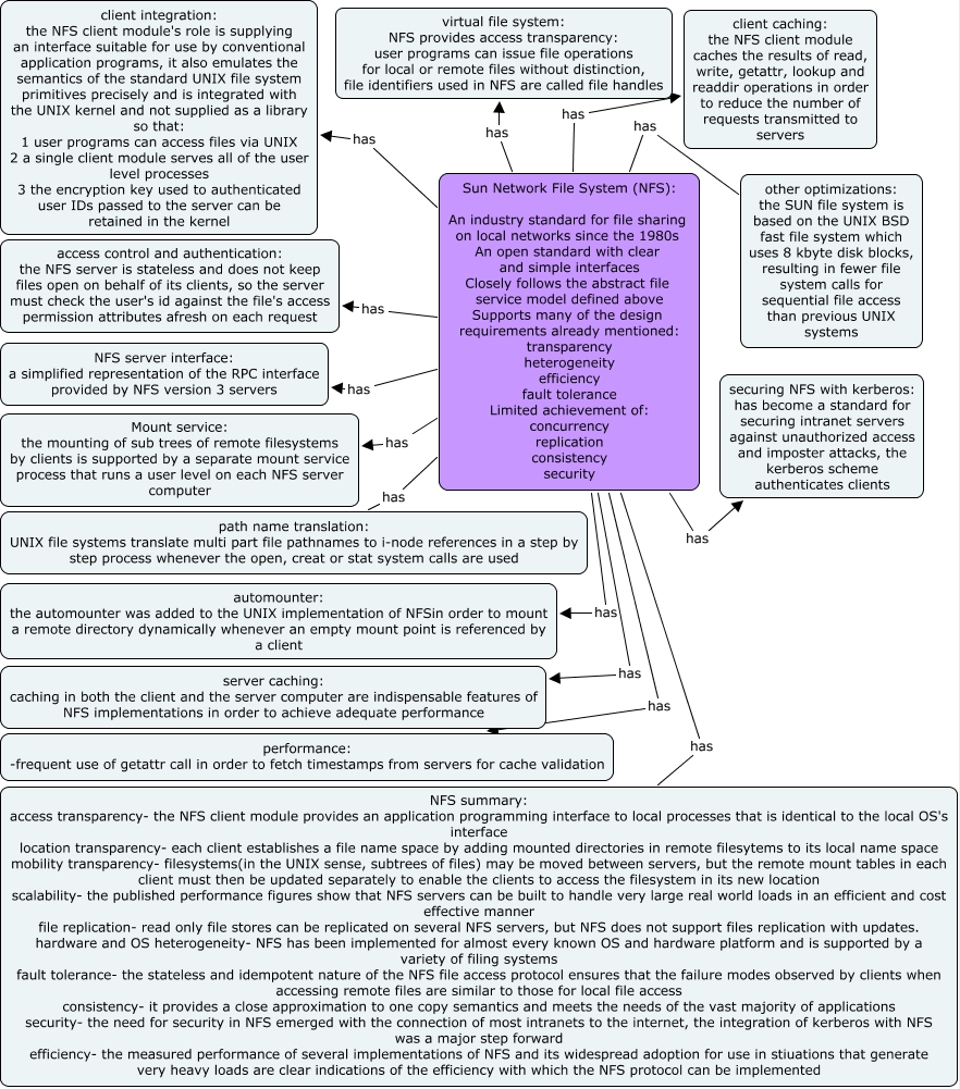 This Concept Map, created with IHMC CmapTools, has information related to: ch8 dist sun, Sun Network File System (NFS): An industry standard for file sharing on local networks since the 1980s An open standard with clear and simple interfaces Closely follows the abstract file service model defined above Supports many of the design requirements already mentioned: transparency heterogeneity efficiency fault tolerance Limited achievement of: concurrency replication consistency security has client integration: the NFS client module's role is supplying an interface suitable for use by conventional application programs, it also emulates the semantics of the standard UNIX file system primitives precisely and is integrated with the UNIX kernel and not supplied as a library so that: 1 user programs can access files via UNIX 2 a single client module serves all of the user level processes 3 the encryption key used to authenticated user IDs passed to the server can be retained in the kernel, Sun Network File System (NFS): An industry standard for file sharing on local networks since the 1980s An open standard with clear and simple interfaces Closely follows the abstract file service model defined above Supports many of the design requirements already mentioned: transparency heterogeneity efficiency fault tolerance Limited achievement of: concurrency replication consistency security has virtual file system: NFS provides access transparency: user programs can issue file operations for local or remote files without distinction, file identifiers used in NFS are called file handles, Sun Network File System (NFS): An industry standard for file sharing on local networks since the 1980s An open standard with clear and simple interfaces Closely follows the abstract file service model defined above Supports many of the design requirements already mentioned: transparency heterogeneity efficiency fault tolerance Limited achievement of: concurrency replication consistency security has path name translation: UNIX file systems translate multi part file pathnames to i-node references in a step by step process whenever the open, creat or stat system calls are used, Sun Network File System (NFS): An industry standard for file sharing on local networks since the 1980s An open standard with clear and simple interfaces Closely follows the abstract file service model defined above Supports many of the design requirements already mentioned: transparency heterogeneity efficiency fault tolerance Limited achievement of: concurrency replication consistency security has NFS summary: access transparency- the NFS client module provides an application programming interface to local processes that is identical to the local OS's interface location transparency- each client establishes a file name space by adding mounted directories in remote filesytems to its local name space mobility transparency- filesystems(in the UNIX sense, subtrees of files) may be moved between servers, but the remote mount tables in each client must then be updated separately to enable the clients to access the filesystem in its new location scalability- the published performance figures show that NFS servers can be built to handle very large real world loads in an efficient and cost effective manner file replication- read only file stores can be replicated on several NFS servers, but NFS does not support files replication with updates. hardware and OS heterogeneity- NFS has been implemented for almost every known OS and hardware platform and is supported by a variety of filing systems fault tolerance- the stateless and idempotent nature of the NFS file access protocol ensures that the failure modes observed by clients when accessing remote files are similar to those for local file access consistency- it provides a close approximation to one copy semantics and meets the needs of the vast majority of applications security- the need for security in NFS emerged with the connection of most intranets to the internet, the integration of kerberos with NFS was a major step forward efficiency- the measured performance of several implementations of NFS and its widespread adoption for use in stiuations that generate very heavy loads are clear indications of the efficiency with which the NFS protocol can be implemented, Sun Network File System (NFS): An industry standard for file sharing on local networks since the 1980s An open standard with clear and simple interfaces Closely follows the abstract file service model defined above Supports many of the design requirements already mentioned: transparency heterogeneity efficiency fault tolerance Limited achievement of: concurrency replication consistency security has automounter: the automounter was added to the UNIX implementation of NFSin order to mount a remote directory dynamically whenever an empty mount point is referenced by a client, Sun Network File System (NFS): An industry standard for file sharing on local networks since the 1980s An open standard with clear and simple interfaces Closely follows the abstract file service model defined above Supports many of the design requirements already mentioned: transparency heterogeneity efficiency fault tolerance Limited achievement of: concurrency replication consistency security has Mount service: the mounting of sub trees of remote filesystems by clients is supported by a separate mount service process that runs a user level on each NFS server computer, Sun Network File System (NFS): An industry standard for file sharing on local networks since the 1980s An open standard with clear and simple interfaces Closely follows the abstract file service model defined above Supports many of the design requirements already mentioned: transparency heterogeneity efficiency fault tolerance Limited achievement of: concurrency replication consistency security has client caching: the NFS client module caches the results of read, write, getattr, lookup and readdir operations in order to