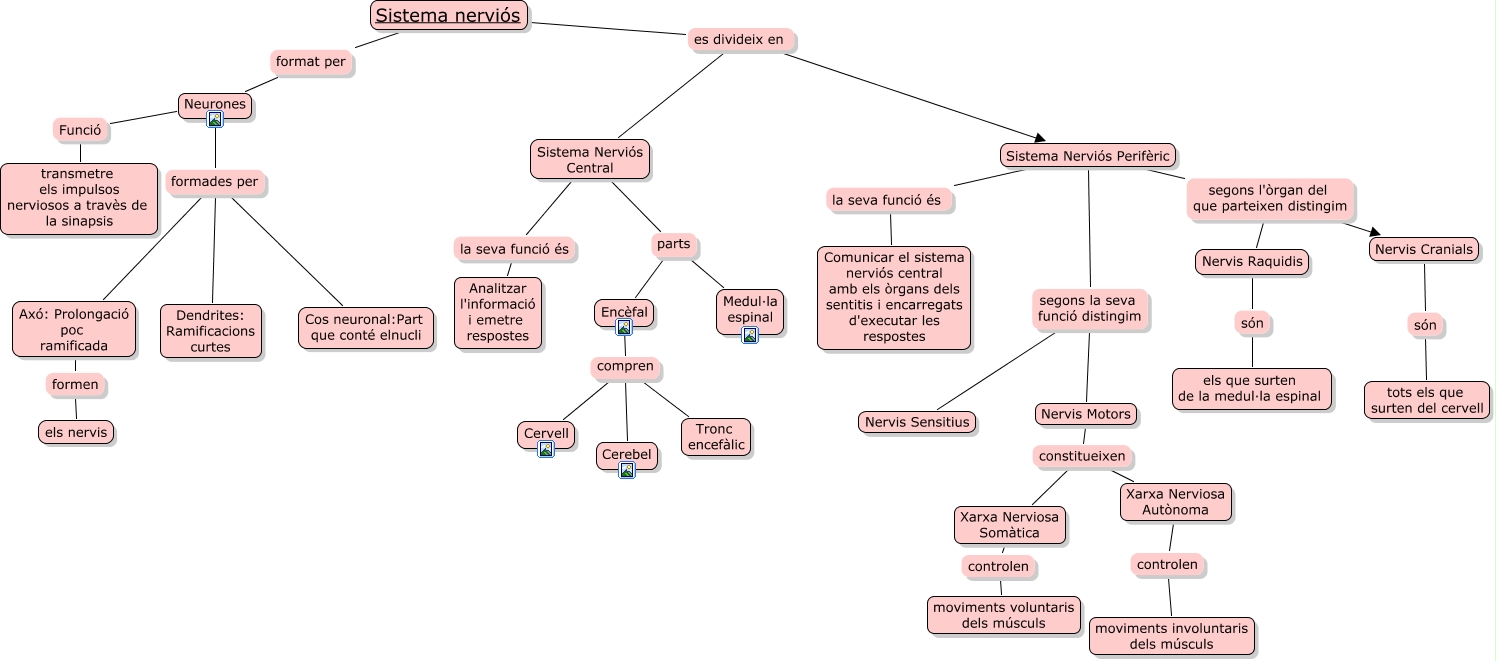 Este Cmap, tiene información relacionada con: El sistema nerviós, Neurones formades per Dendrites: Ramificacions curtes, Neurones formades per Axó: Prolongació poc ramificada, Sistema Nerviós Perifèric segons l'òrgan del que parteixen distingim Nervis Raquidis, Nervis Motors constitueixen Xarxa Nerviosa Somàtica, Sistema Nerviós Perifèric la seva funció és Comunicar el sistema nerviós central amb els òrgans dels sentitis i encarregats d'executar les respostes, Encèfal compren Cerebel, Sistema nerviós es divideix en Sistema Nerviós Perifèric, Sistema Nerviós Perifèric segons la seva funció distingim Nervis Sensitius, Xarxa Nerviosa Autònoma controlen moviments involuntaris dels músculs, Sistema Nerviós Perifèric segons la seva funció distingim Nervis Motors, Encèfal compren Cervell, Nervis Cranials són tots els que surten del cervell, Sistema Nerviós Perifèric segons l'òrgan del que parteixen distingim Nervis Cranials, Sistema Nerviós Central la seva funció és Analitzar l'informació i emetre respostes, Axó: Prolongació poc ramificada formen els nervis, Encèfal compren Tronc encefàlic, Nervis Motors constitueixen Xarxa Nerviosa Autònoma, Sistema nerviós format per Neurones, Xarxa Nerviosa Somàtica controlen moviments voluntaris dels músculs, Sistema Nerviós Central parts Encèfal