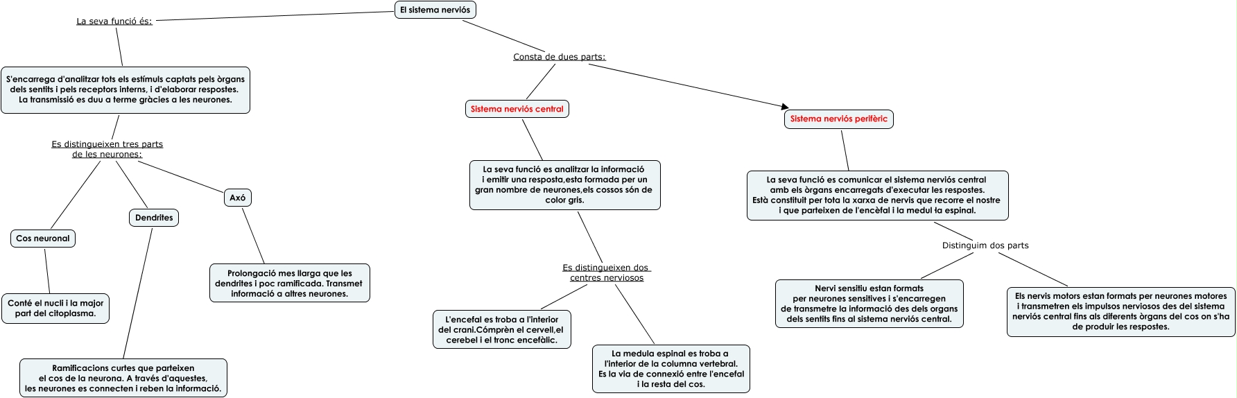 Este Cmap, tiene información relacionada con: sistema nerviós, Axó ???? Prolongació mes llarga que les dendrites i poc ramificada. Transmet informació a altres neurones., Cos neuronal ???? Conté el nucli i la major part del citoplasma., S'encarrega d'analitzar tots els estímuls captats pels òrgans dels sentits i pels receptors interns, i d'elaborar respostes. La transmissió es duu a terme gràcies a les neurones. Es distingueixen tres parts de les neurones: Axó, El sistema nerviós La seva funció és: S'encarrega d'analitzar tots els estímuls captats pels òrgans dels sentits i pels receptors interns, i d'elaborar respostes. La transmissió es duu a terme gràcies a les neurones., Sistema nerviós central ???? La seva funció es analitzar la informació i emitir una resposta,esta formada per un gran nombre de neurones,els cossos són de color gris., La seva funció es comunicar el sistema nerviós central amb els òrgans encarregats d'executar les respostes. Està constituit per tota la xarxa de nervis que recorre el nostre i que parteixen de l'encèfal i la medul·la espinal. Distinguim dos parts Nervi sensitiu estan formats per neurones sensitives i s'encarregen de transmetre la informació des dels organs dels sentits fins al sistema nerviós central., La seva funció es analitzar la informació i emitir una resposta,esta formada per un gran nombre de neurones,els cossos són de color gris. Es distingueixen dos centres nerviosos La medula espinal es troba a l'interior de la columna vertebral. Es la via de connexió entre l'encefal i la resta del cos., S'encarrega d'analitzar tots els estímuls captats pels òrgans dels sentits i pels receptors interns, i d'elaborar respostes. La transmissió es duu a terme gràcies a les neurones. Es distingueixen tres parts de les neurones: Dendrites, La seva funció es comunicar el sistema nerviós central amb els òrgans encarregats d'executar les respostes. Està constituit per tota la xarxa de nervis que recorre el nostre i que parteixen de l'encèfal i la medul·la espinal. Distinguim dos parts Els nervis motors estan formats per neurones motores i transmetren els impulsos nerviosos des del sistema nerviós central fins als diferents òrgans del cos on s'ha de produir les respostes., S'encarrega d'analitzar tots els estímuls captats pels òrgans dels sentits i pels receptors interns, i d'elaborar respostes. La transmissió es duu a terme gràcies a les neurones. Es distingueixen tres parts de les neurones: Cos neuronal, El sistema nerviós Consta de dues parts: Sistema nerviós central, Sistema nerviós perifèric ???? La seva funció es comunicar el sistema nerviós central amb els òrgans encarregats d'executar les respostes. Està constituit per tota la xarxa de nervis que recorre el nostre i que parteixen de l'encèfal i la medul·la espinal., La seva funció es analitzar la informació i emitir una resposta,esta formada per un gran nombre de neurones,els cossos són de color gris. Es distingueixen dos centres nerviosos L'encefal es troba a l'interior del crani.Cómprèn el cervell,el cerebel i el tronc encefàlic., El sistema nerviós Consta de dues parts: Sistema nerviós perifèric, Dendrites ???? Ramificacions curtes que parteixen el cos de la neurona. A través d'aquestes, les neurones es connecten i reben la informació.