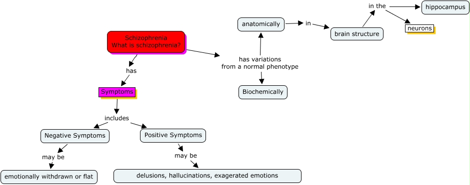 This Concept Map, created with IHMC CmapTools, has information related to: schizophrenia omara, Positive Symptoms may be delusions, hallucinations, exagerated emotions, Symptoms includes Positive Symptoms, Negative Symptoms may be emotionally withdrawn or flat, Symptoms includes Negative Symptoms, brain structure in the neurons, anatomically in brain structure, Schizophrenia What is schizophrenia? has variations from a normal phenotype Biochemically, Schizophrenia What is schizophrenia? has variations from a normal phenotype anatomically, brain structure in the hippocampus, Schizophrenia What is schizophrenia? has Symptoms