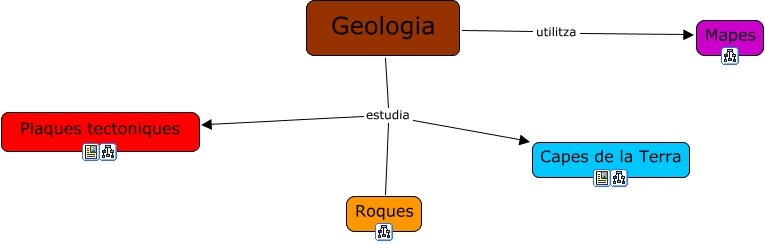 Este mapa conceptual tiene información relacionada a: Geologia, Geologia estudia Capes de la Terra, Geologia estudia Plaques tectoniques, Geologia utilitza Mapes, Geologia estudia Roques